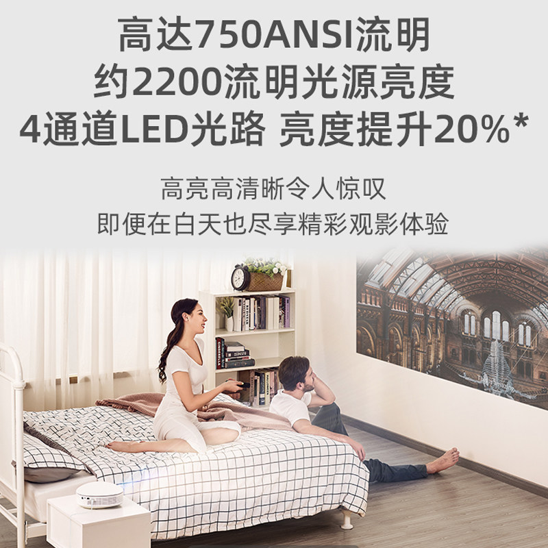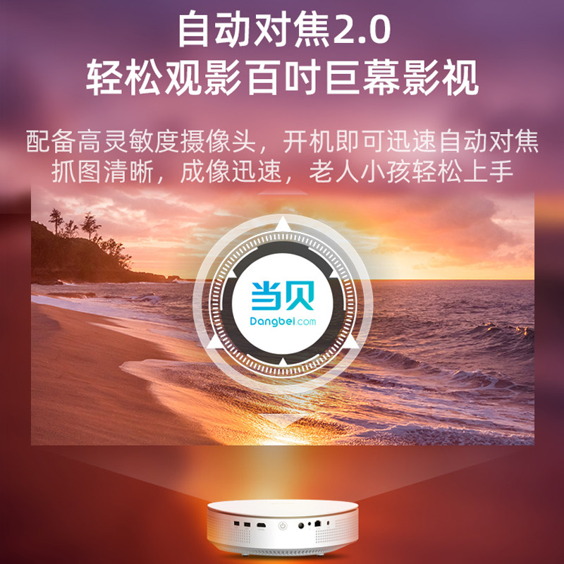 显示方面,采用4通道LED RGB+B,亮度为750ANSI流明,支持梯形校正、HDR10,拥有800P/720P分辨率,支持1080P解码。这款投影支持当贝2.0自动对焦,配备高灵敏度摄像头,开机即可迅速自动对焦,抓图清晰,成像迅速,老人小孩轻松上手。智能梯形校正,支持智能侧投,放在床头、桌边、茶几也能投出方正画面。