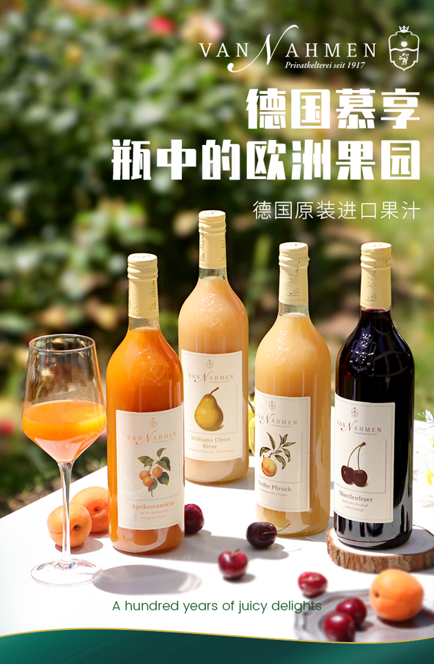 果汁甄选欧洲特定果园单一品种原果,经过严苛挑选后,原果低温冷榨,避免了高温氧化,减少变色变味,更好的保留营养和味道,无色素、无香精、无防腐剂,巴士杀菌后直接热灌装封瓶,减少受热时间,降低对风味营养破坏。