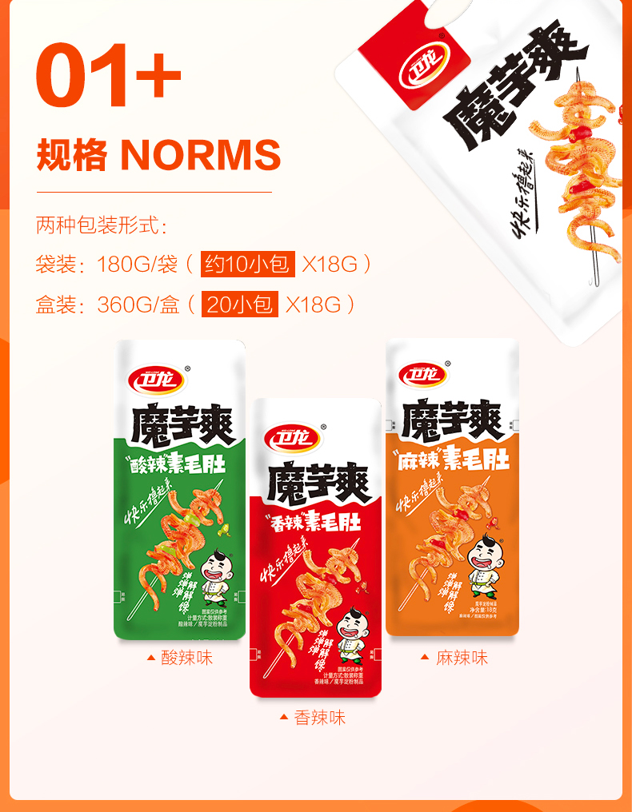 卫龙神奇魔芋爽,吃不胖的辣条零食。卫龙魔芋爽30多万网友一致好评。多种口味任你选择,零食界杠把子,食品企业认证,神奇魔芋,素毛肚嚼劲十足,减肥也可以吃,0脂肪Q弹!升级魔芋组合,味道更绝!领券链接点此