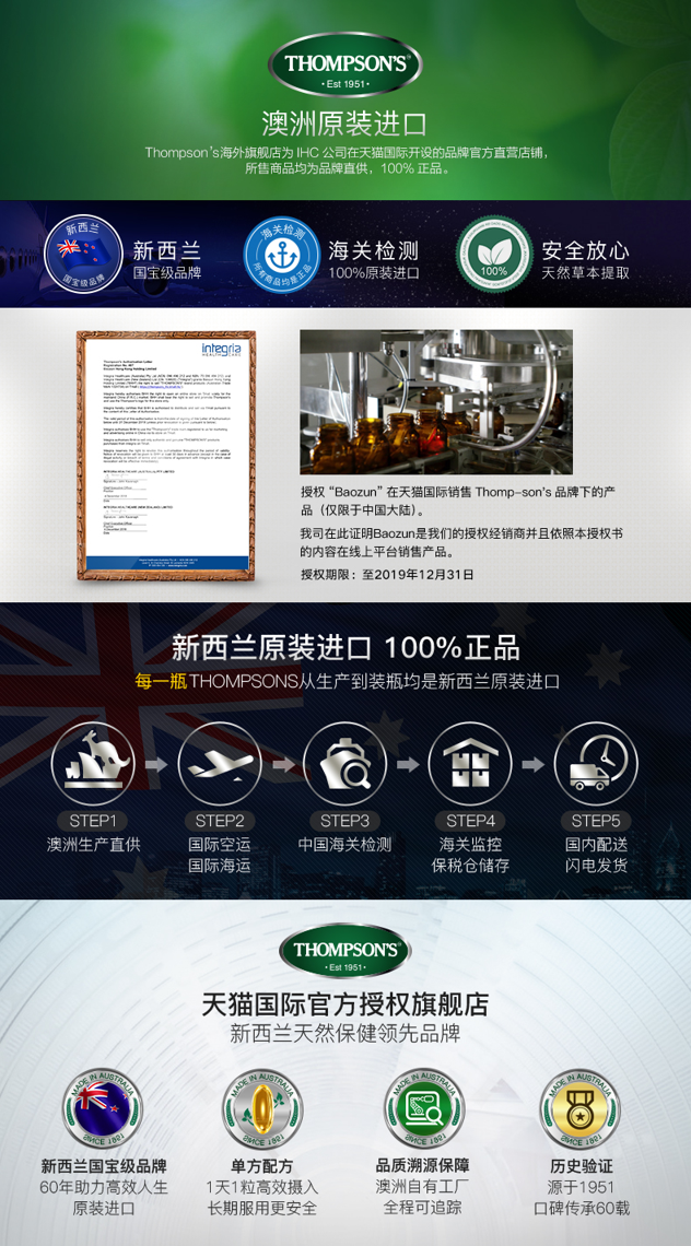 Thompson's的中文名是汤普森,成立于1951年,经过60多年的发展,如今已是最大的保健生产商。旗下产品均符合GMP(优良药品制药作业规范)和TGA的严格标准。