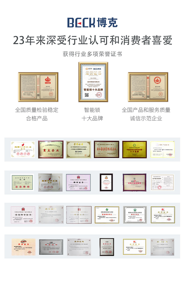 中国智能锁十大品牌,BECK(博克)创立于1998年,是一家集研发、 生产、销售、安装、售后为一体的国家高新技术企业;是全球著名智能锁制造商,核心事业包括智能锁领域、智能门禁领域、智能门控配件领域等。为中国银行、中国工商银行、广发银行等十余家银行提供安保产品服务,2018年成为央视CCTV战略合作品牌。