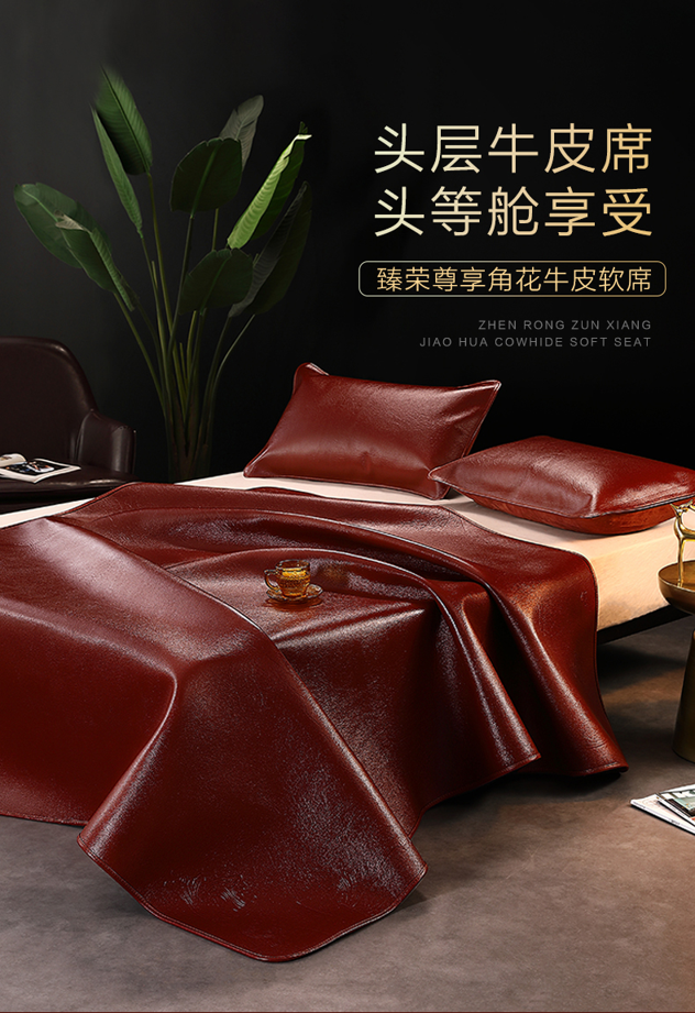牛皮凉席,采用头层水牛皮作为原料,手感光滑如丝,凉而不冰,是真正的健康凉席,具有保健肌肤、透气散热、经久耐用的优点。