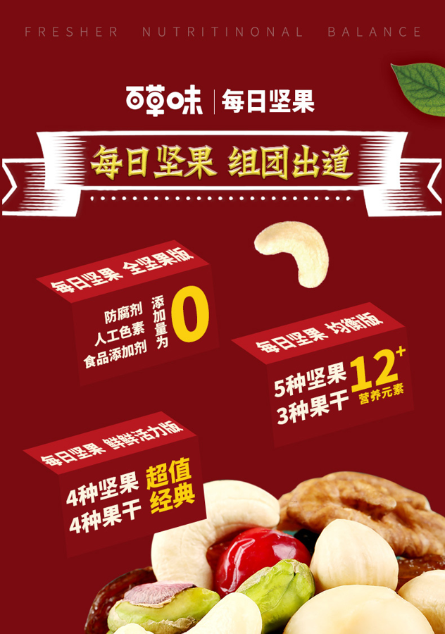 专利分区锁鲜,坚果水分<4%、果干水分14-20%,坚果酥脆。果干鲜嫩,口感更佳是名副其实的高端款。规格:25g*30袋 礼盒装,自用送人都适合。