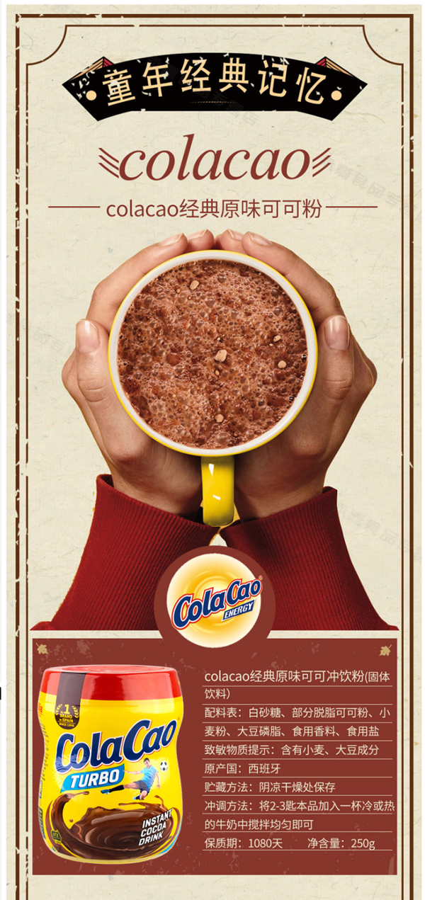 这款ColaCao 经典原味可可粉,西班牙原装进口,精选上好脱脂可可粉,经过一系列加工提炼,粉质细腻不易结块,伴随有浓浓的巧克力香,冲泡后质地细腻口感顺滑。