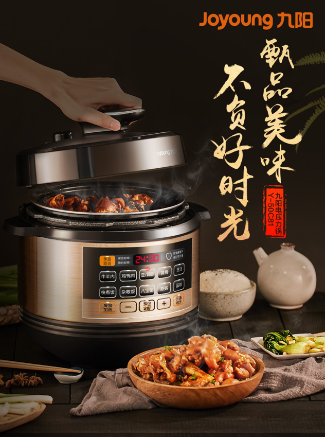 九阳的这款电压力锅,优雅黑和香槟金搭配,带有金属拉丝工艺,更加具有美感,很时尚。触屏大按键面板,有12大常用菜单,标准饭、煮粥、煲汤、排骨、鸡鸭肉、牛羊肉、豆蹄筋、八宝粥、蛋糕;