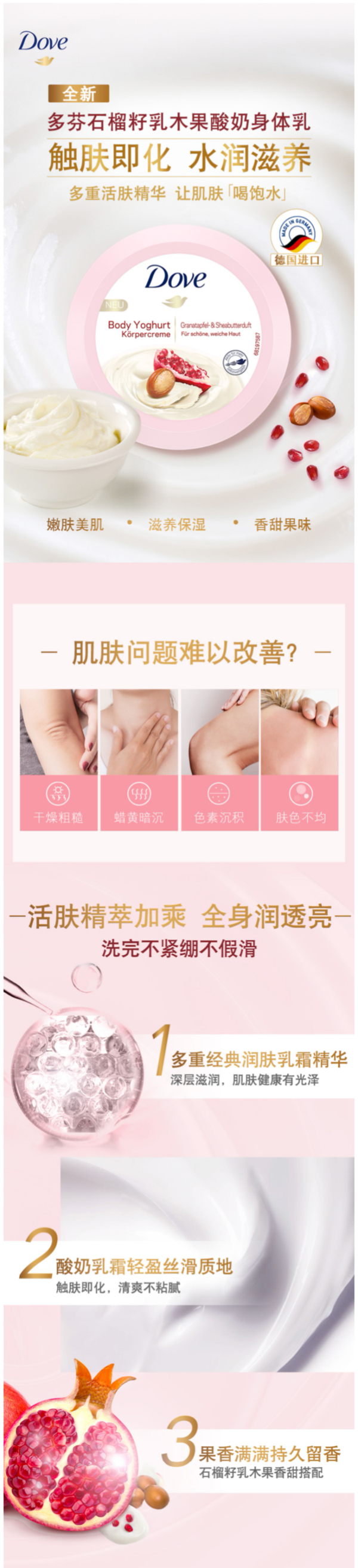 这款多芬Dove 石榴籽和乳木果冰淇凌身体乳,是新鲜石榴籽搭配乳木果,能够改善肌肤暗沉、深层滋润皮肤;细腻冰淇淋乳霜质地,触肤即化,不黏腻,同时果香四溢,规格是283g。