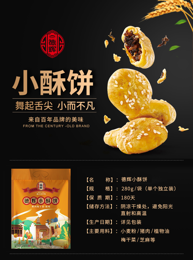 这款小酥饼秉承古法工艺制作,非油炸纯烘焙制作,不添加任何防腐剂,出炉后的酥饼层次分明,内里馅料梅干菜与猪肉6:4,咸香不腻非常好吃,严格执行ISO22000食品安全管理体系,保证吃着放心,内有独立小包装,更易携带,吃起来更方便。
