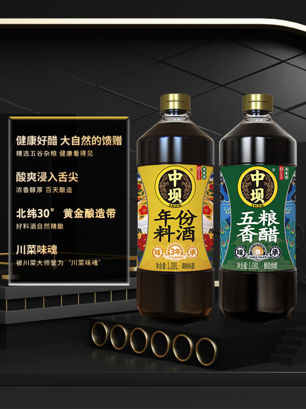 中坝五粮香醋1.08L+年份料酒1.08L,精选优质大米、大麦、非转基因玉米、糯米和小麦五粮为原料,百年配方配制,经过23道传统工序,以此酿得一缸醋香绵长、味醇厚。