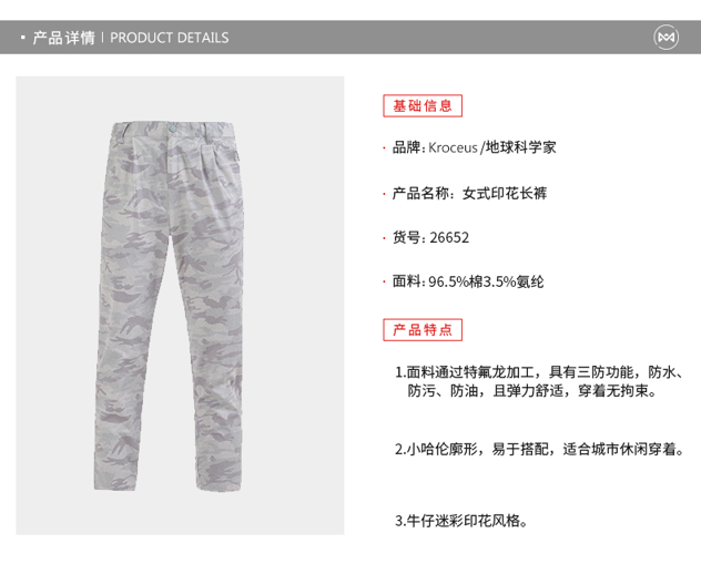 在款式上,小哈伦裤的廓型,易于搭配,3D立体剪裁,上身更合体有型,不肥不紧,裤身上是牛仔迷彩印花,适合城市休闲时穿。