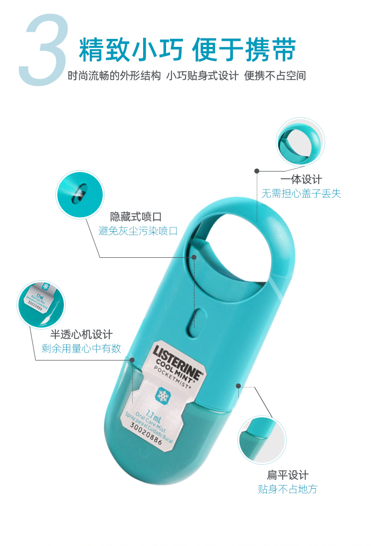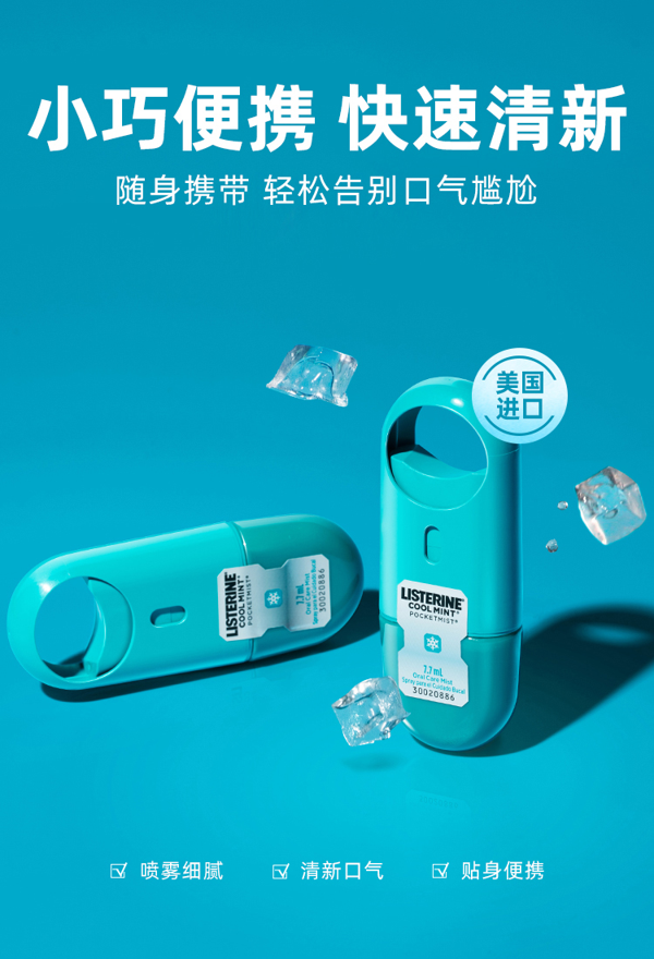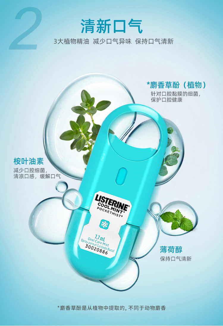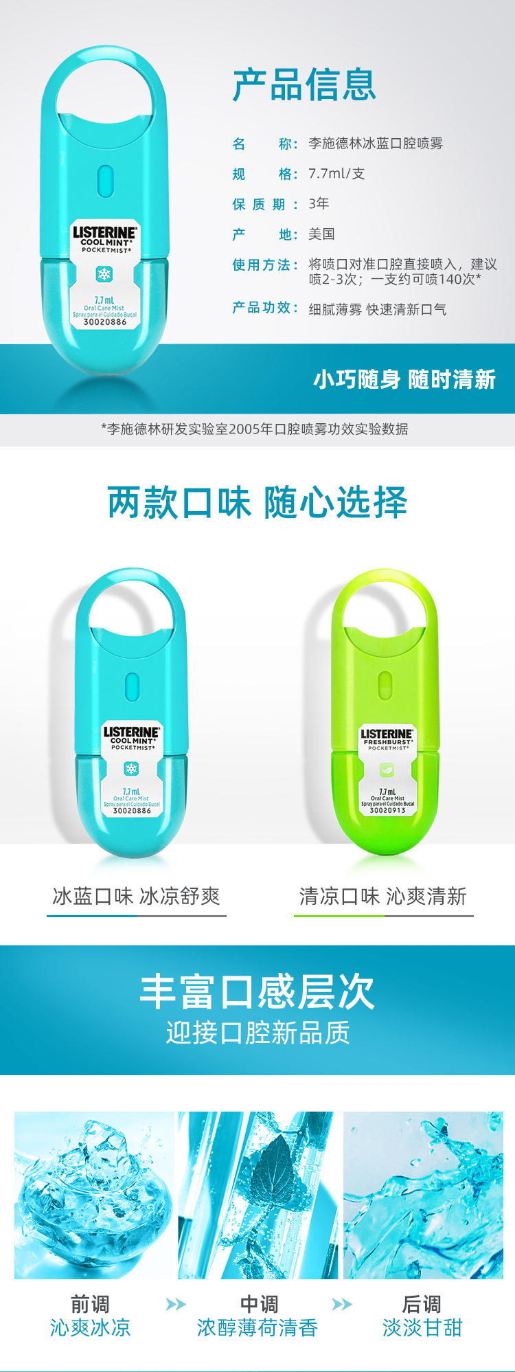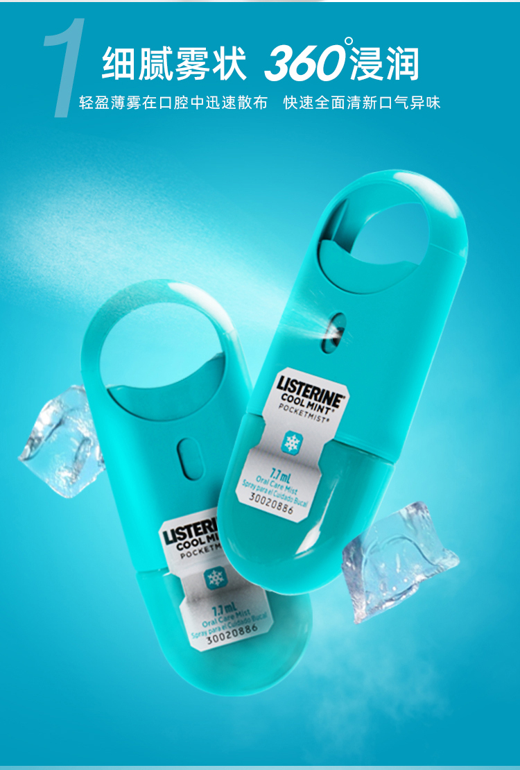 这款李施德林 口腔喷雾,主要作用是清新口气,去除口臭,冰蓝口感,无糖零卡路里,安全健康。外形是扁平设计,便于便携;薄雾小滴液设计,能直达口腔,帮助改善口腔健康。