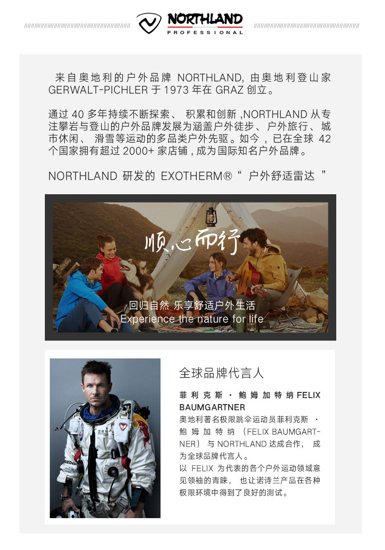 诺诗兰Northland是奥地利户外品牌,冬季户外服装是其优势产品线,其产品很多使用Gore-Tex、Polartec、Primaloft、Vibram大牌材料,面料靠谱,虽在设计上不如一线户外品牌,但品质也非国内品牌可比。可以理解成是一个喜欢堆料的高性价比户外品牌。
