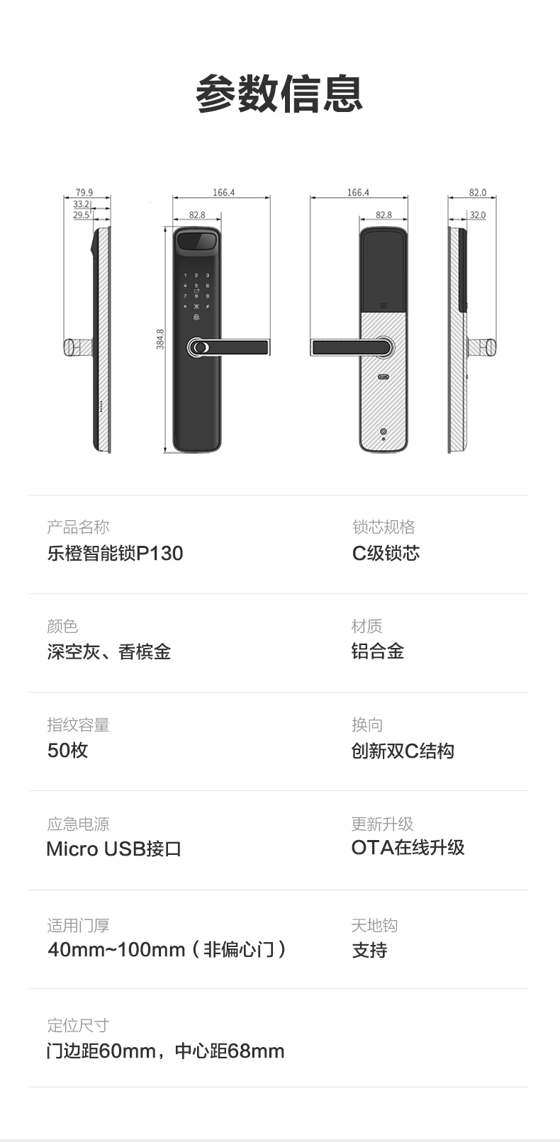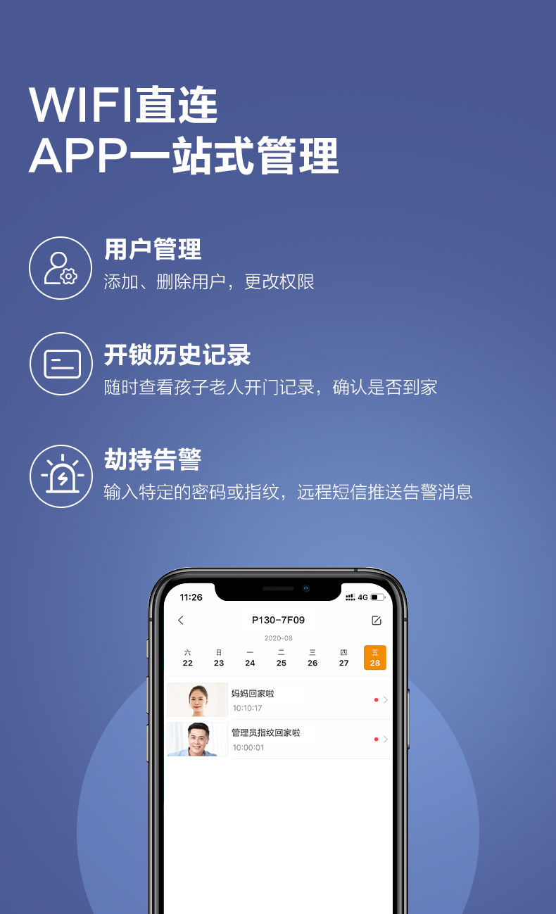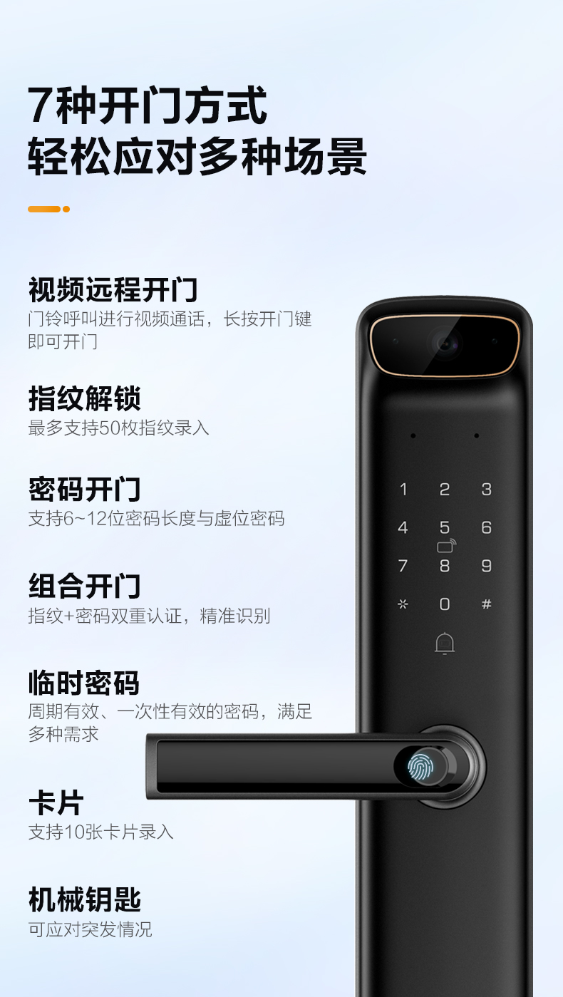 此款智能锁有生物指纹、app远程、密码、钥匙、智能卡、临时密码、指纹+密码组合开锁 7种开锁方式,满足不同的需求。
