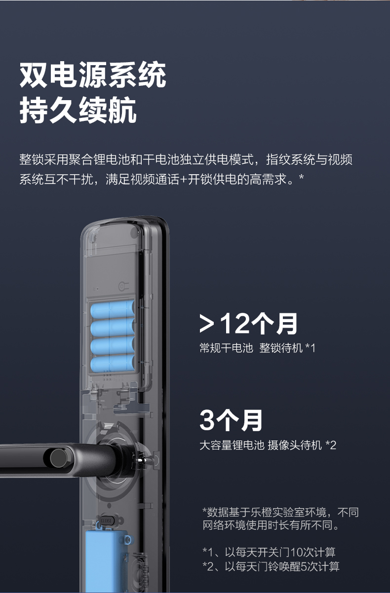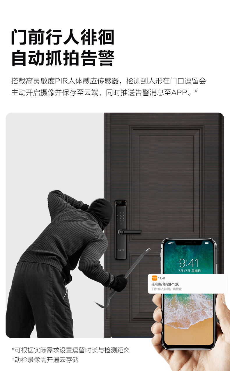 高灵敏PIR人体感应系统,门前人形徘徊,主动摄像并推送APP告警,所有录像信息,上传至云端,安全认证,信息加密,通过手机APP可随时查看,不占手机内存。采用锂电池+干电池双电源系统,指纹、视频独立供电互不干扰、续航更持久。