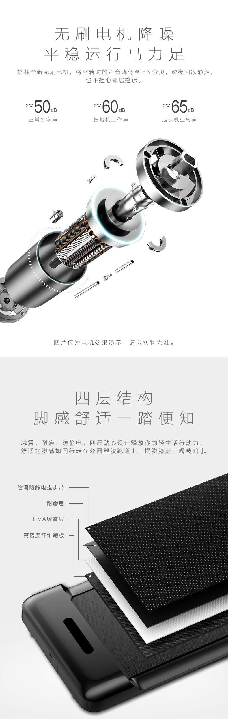 跑带是防滑防静电走步带、低摩擦系数的耐磨层、自带缓震效果的EVA柔软层、坚固耐用的高密度纤维跑板组成,除了拥有出色的脚感外,还有缓震效果,避免膝盖损伤。
