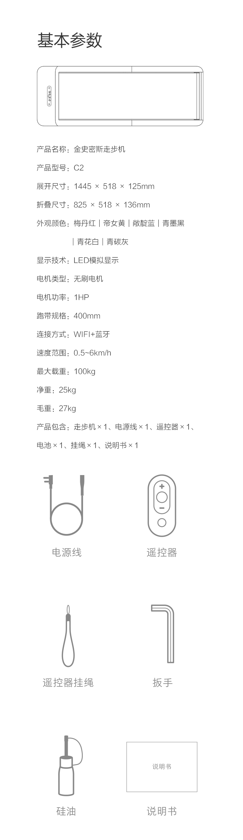 跑带 400mm,最大载重 100kg,范围速度 0.5~6km/h。