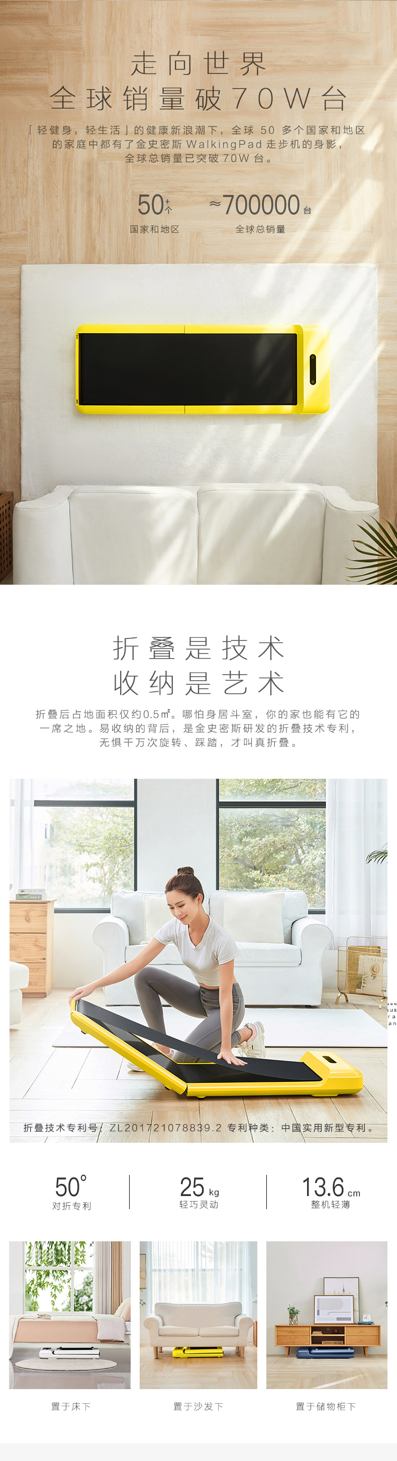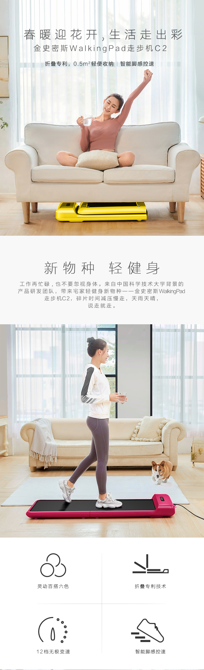 这款WalkingPad C2可折叠静音走步机,是2021年的新款,可折叠收纳,厚度仅13.6厘米,占地面积不足0.5㎡,算是完全不占地,随着找个角落放着就行。净重25kg,底部配有滑动滚轮,拖拽很方便,基本不费力。