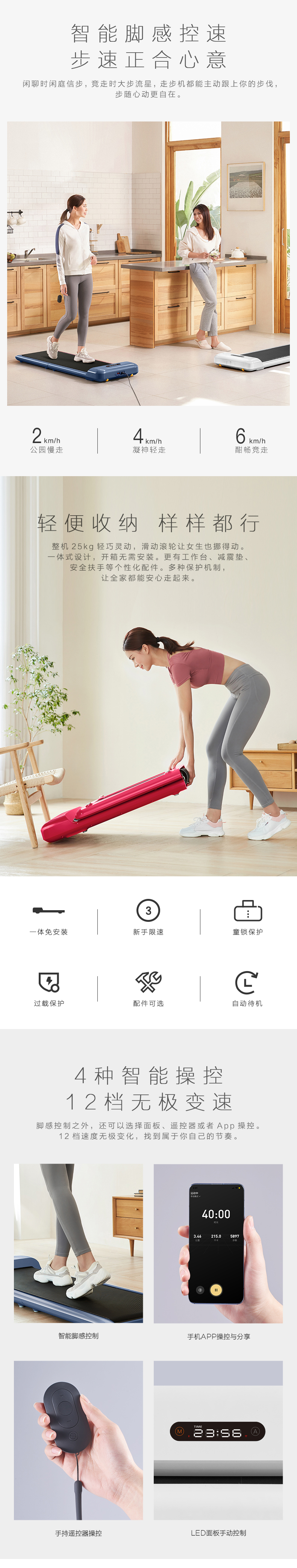 有脚感、选择面板、遥控器和APP控速,12档无极变速,重点强调下脚感控速,就是无论是你走快或者走慢,走步机都能主动跟上你的步伐,非常省心方便。