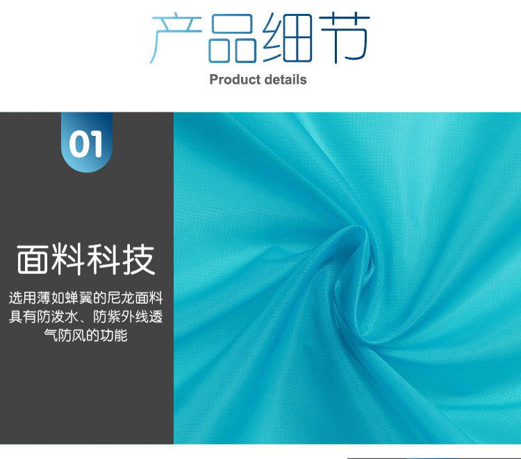 这款皮肤风衣还支持「UPF 50+」的50倍防晒。UPF值是防紫外线系数,UPF值为40,即只有1/40的紫外线可以穿透,俗称「40倍防晒」。UPF值从10+到50+,UPF>50时,标为UPF 50+,此时紫外线对人的影响可忽略不计,所以UPF值最高就是UPF 50+。国标GB/T 23147-2008要求,UPF40+起,才可宣传自己是防紫外线产品,或叫防晒服。