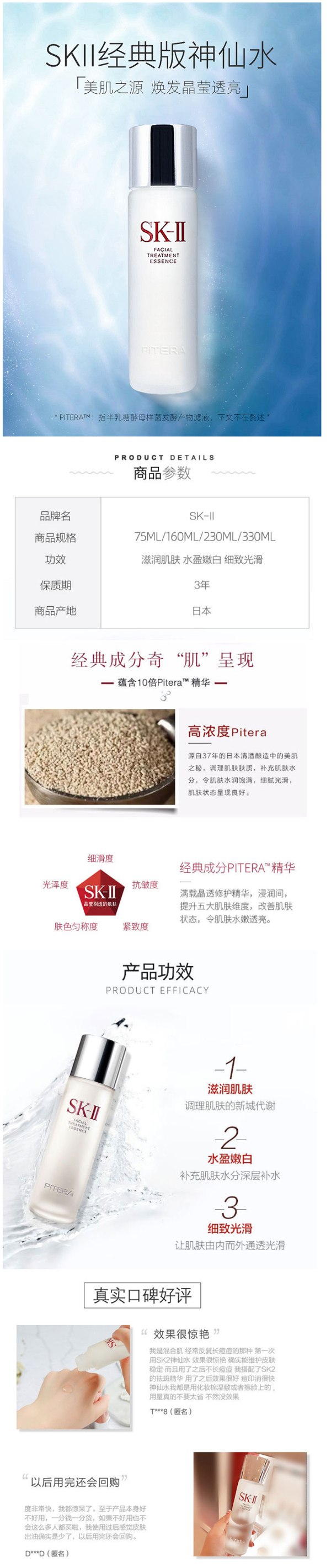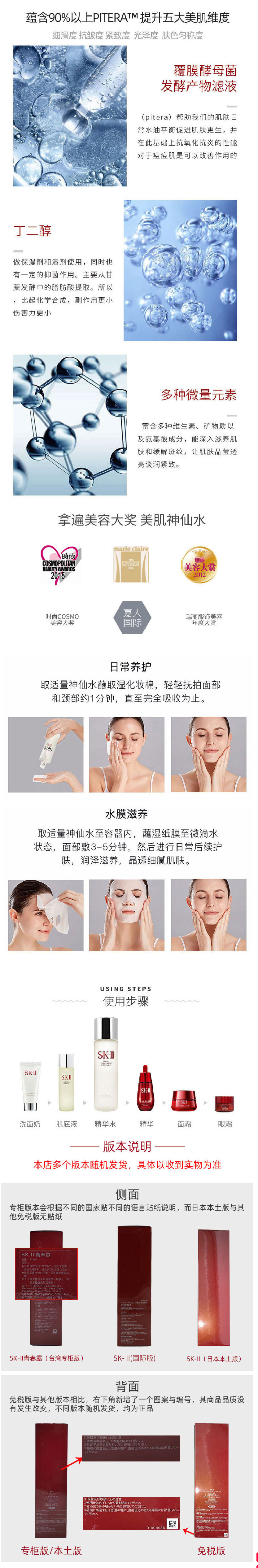 SK-II神仙水含有高达90%以上的富含多种营养成分的PiteraTM酵母精华。每天为肌肤提供充足营养并调理肌肤,深层保湿,平衡肌肤的pH值,塑造润泽光洁的肌肤本色。 PiteraTM提升五大美肌维度,让肌肤升华至晶莹剔透: