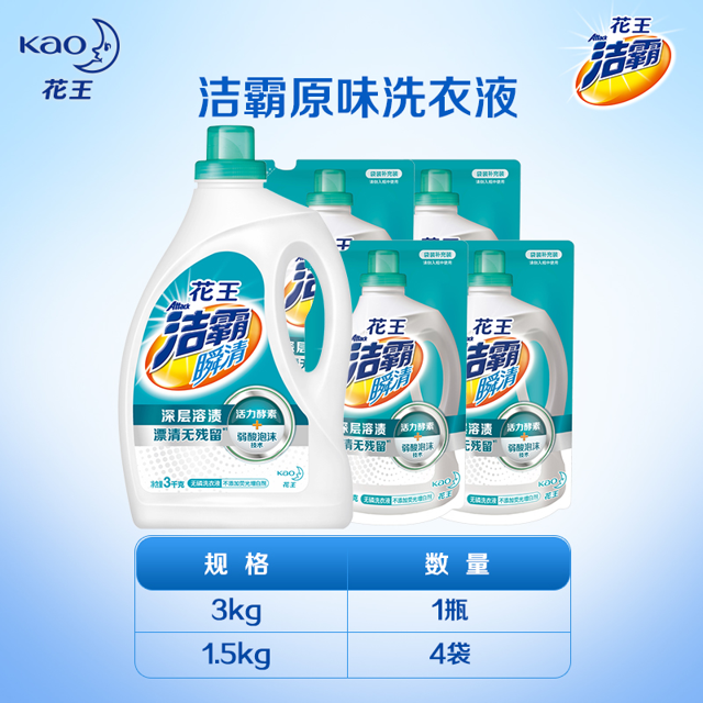 规格3kg*1瓶+补充装1.5kg*4袋,共18斤,洁净力与之前款有了大幅提升。