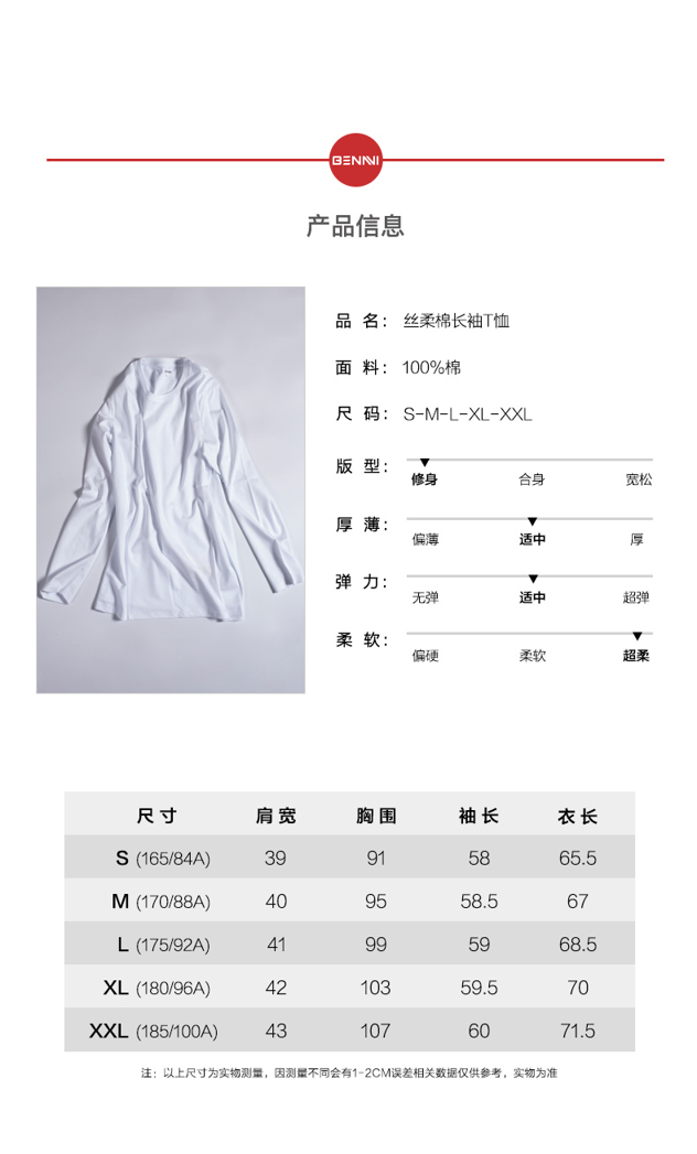 本米纯棉T恤,选用新疆长绒棉,织成200高克重面料,厚薄适中。适合春秋打底穿着。面料未经过化学处理,留有纯棉表面绒绒的质感。