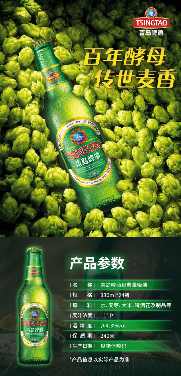 这款经典量贩装是青啤最经典、最畅销的一款。选用优质大米、麦芽、上等啤酒花和软硬适度、洁净甘美的崂山矿泉水为原料酿制而成。原麦汁浓度为11度,酒精含量4.3%。酒液清澈透明、呈淡黄色,泡沫细腻洁白、麦香浓郁,酒体沉厚柔和,香醇爽口。