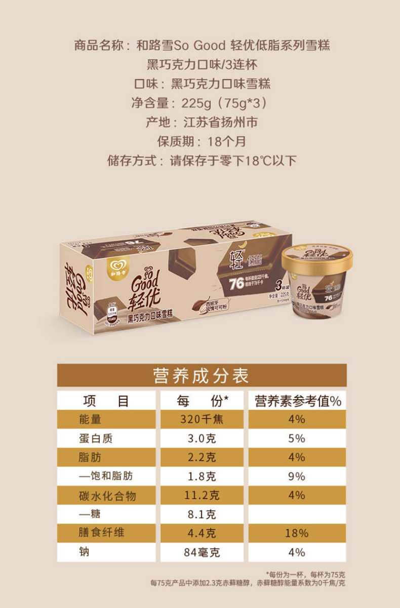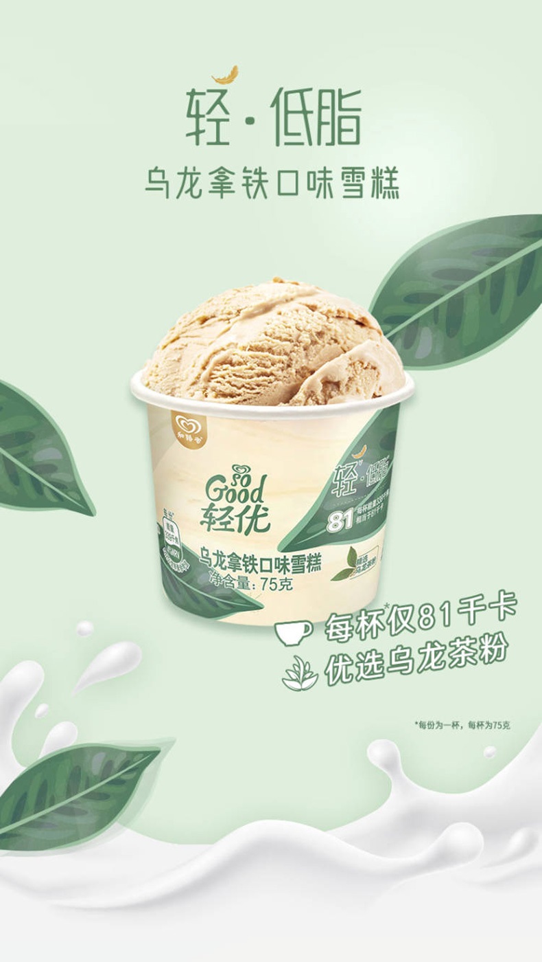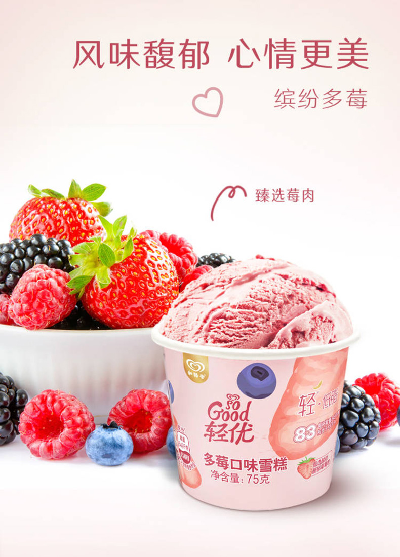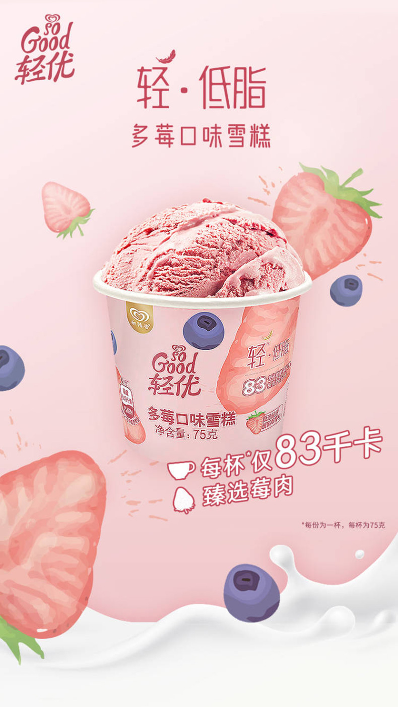 和路雪出品的低脂低卡雪糕,单杯仅80卡左右,每杯的热量不到1根香蕉,采用优质乳脂制作,甄选优质材料,新鲜水果和进口可可粉,甜菊糖苷代糖,热量几乎为0,既保持了冰淇淋本来的口感,又减少了脂肪和卡路里的含量,减肥也能放心吃。
