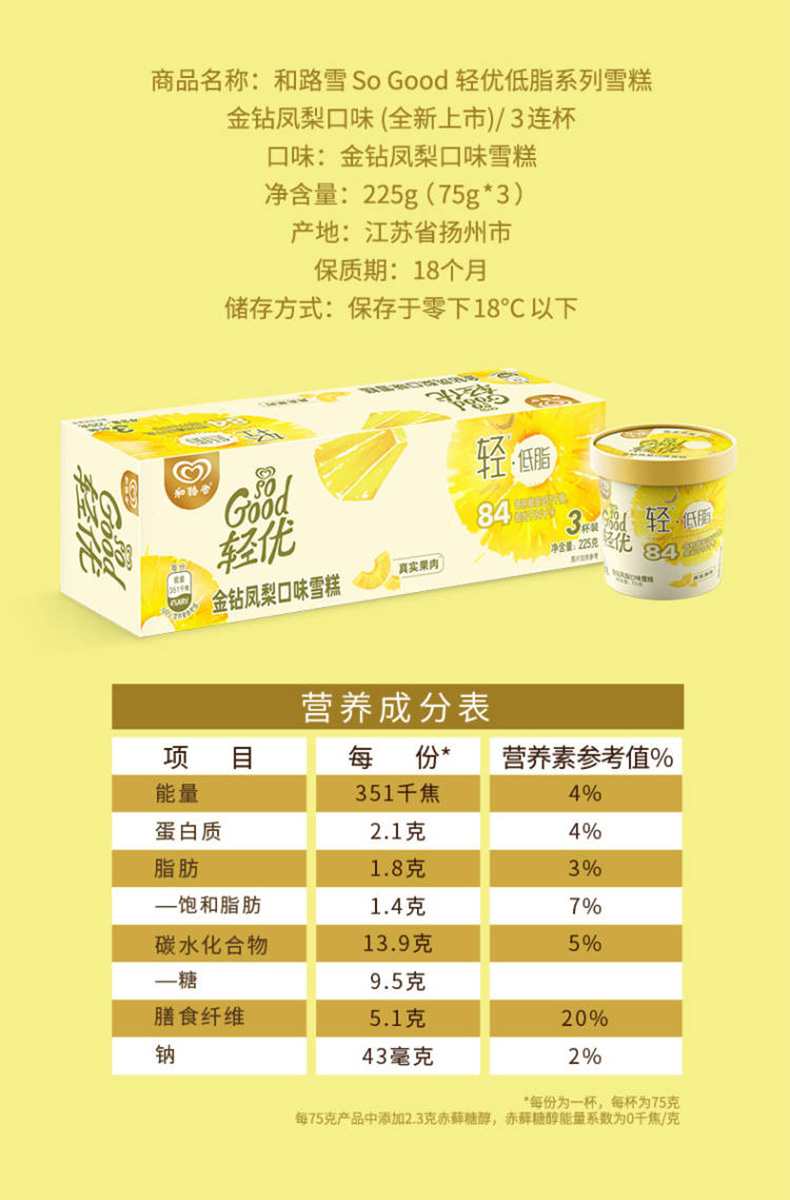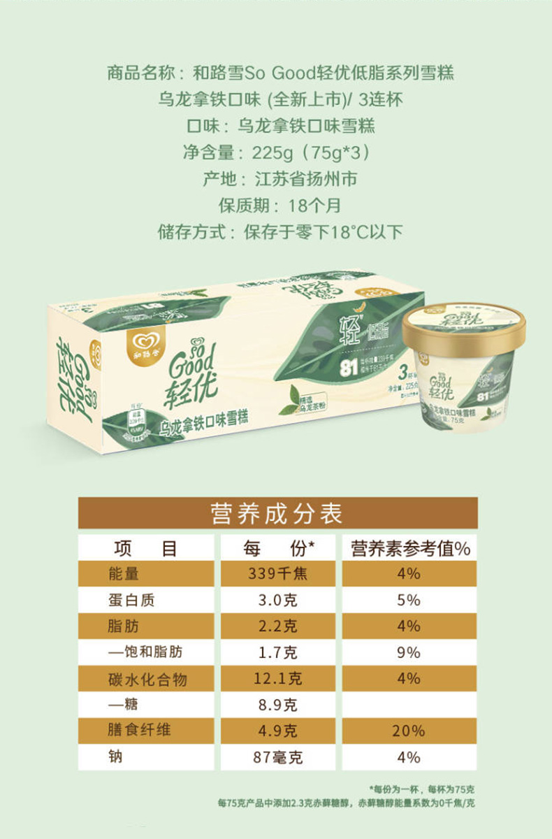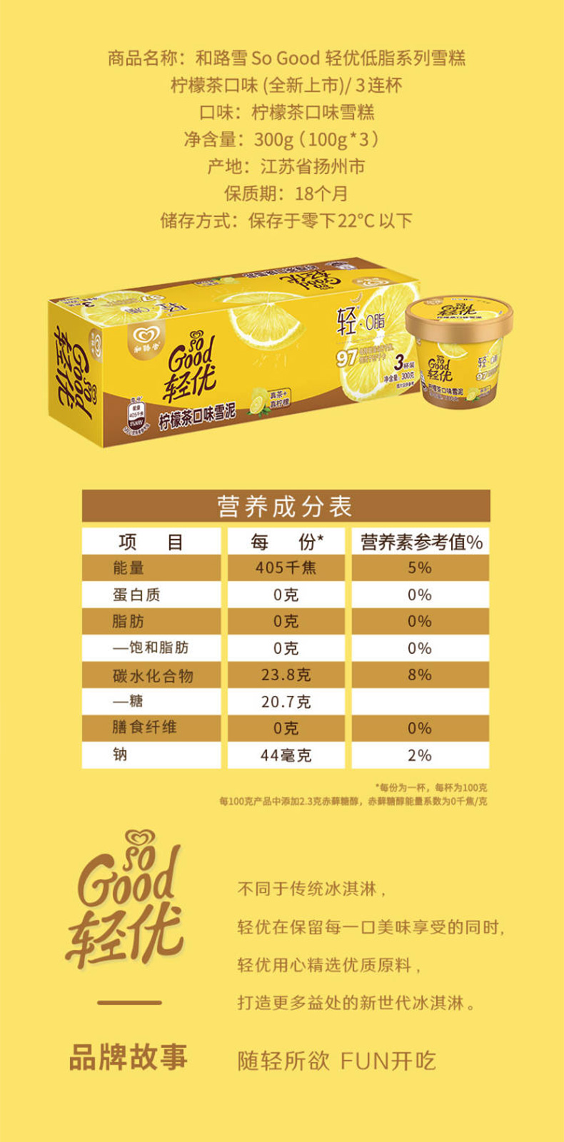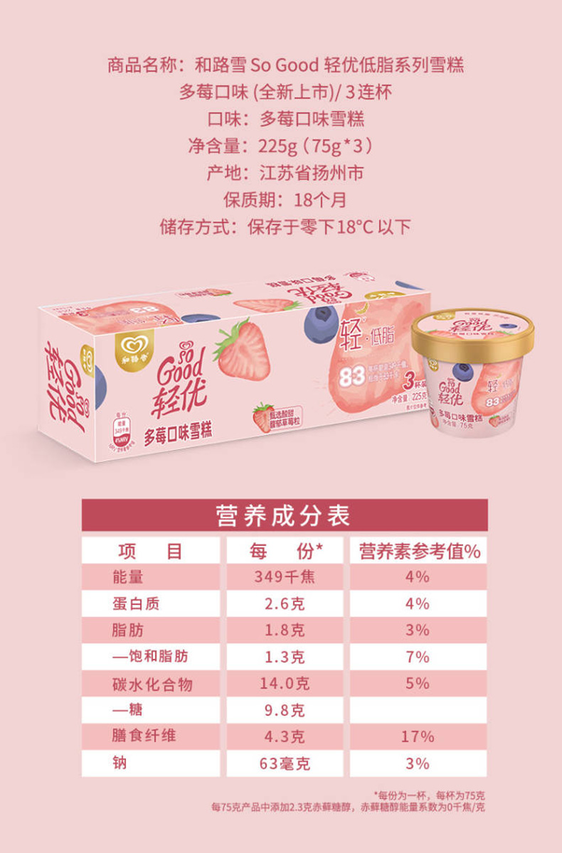 和路雪出品的低脂低卡雪糕,单杯仅80卡左右,每杯的热量不到1根香蕉,采用优质乳脂制作,甄选优质材料,新鲜水果和进口可可粉,甜菊糖苷代糖,热量几乎为0,既保持了冰淇淋本来的口感,又减少了脂肪和卡路里的含量,减肥也能放心吃。