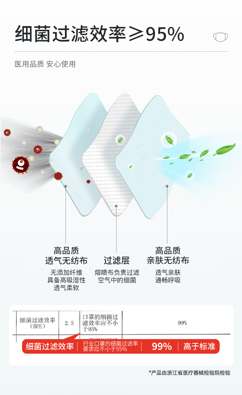 买一送一,共发100只。这款振德医疗 一次性防护医用口罩,外层无纺布,中间熔喷过滤布,内层无纺布,三层防护,过滤空气中的多种有害物质。立体剪裁,适合大多数脸型,舒适贴合,鼻梁处折角佩戴效果更贴合,密封性更好。无纺布耳带,透气,抗拉扯,佩戴舒适。