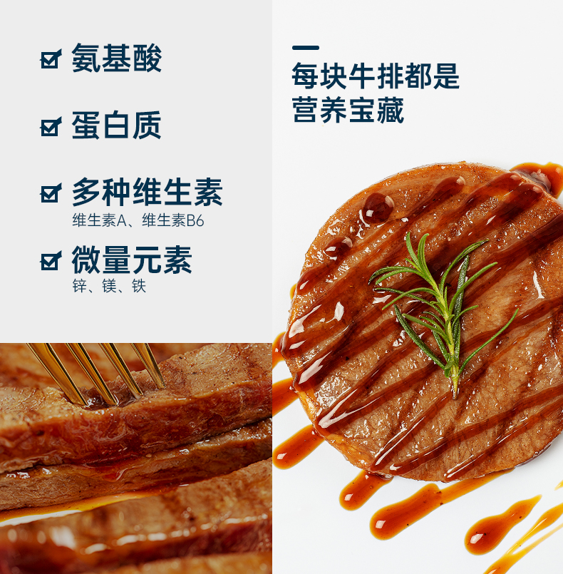 这款小牛凯西菲力牛排,牧场直采新鲜真牛肉,经过层层质检测,手工修筋去膜,静置排酸微腌制,脂肪含量低,肉质细嫩多汁。