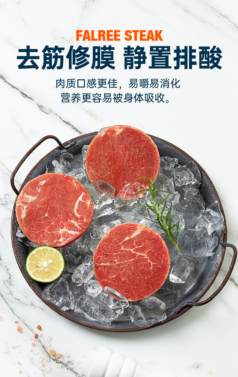 菲力牛排取自牛背柔软瘦肉部位,油脂含量极低,肉质软嫩,口感绵细柔软,营养丰富易消化,非常适合老人和儿童食用,可煎制7分熟甚至全熟。