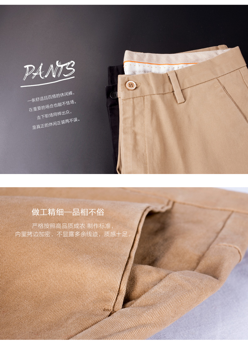 本米男士休闲裤,面料是斜纹线卡面料,以97%棉混3%氨纶弹力纤维,带有微弹力,穿着无拘束舒适度比较好。整体直筒版型,在小腿处略收紧,瞬间拉长腿部线条。除了左右裤袋,后身也有口袋。风格介于正装和休闲之间,面料厚度中等,四季可穿。