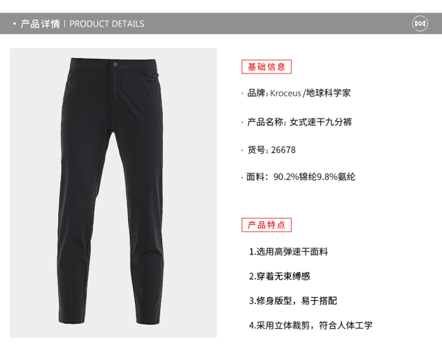 这款地球科学家女速干裤,使用靠谱的抗撕裂速干尼龙面料,耐磨抗撕裂不易破损。尼龙纱线呈多股中空状,中空管道快速吸水快速向四周分散,加大挥发面积达到快干,通常在雨天淋湿后不到1小时就能干。