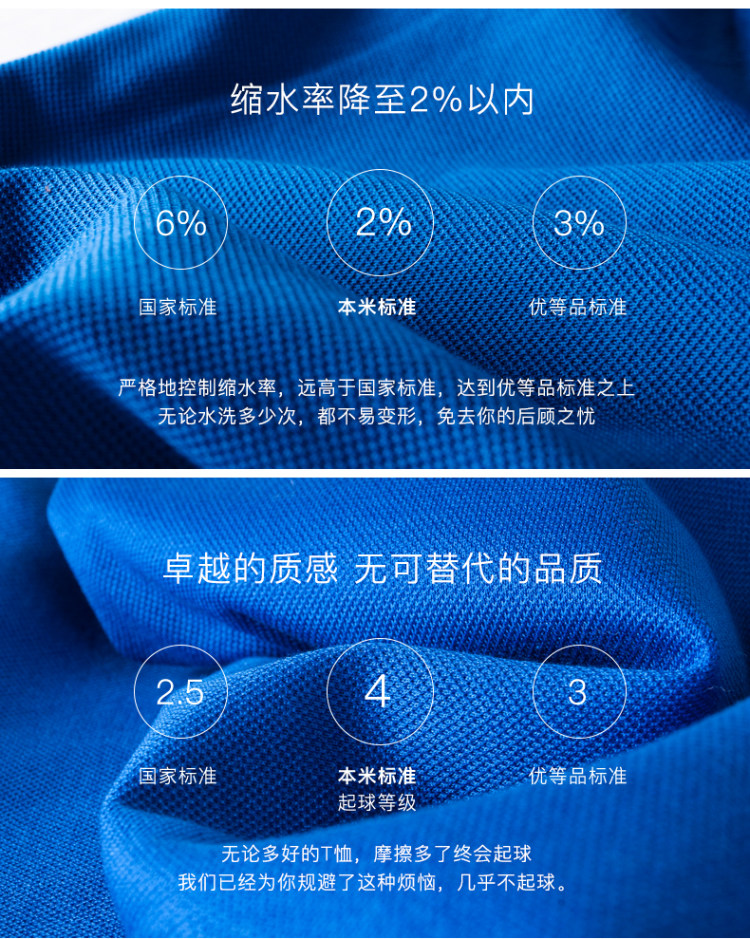 本米这款Polo衫,用的是拉夫劳伦紫标同样面料,60支美国皮马棉双股纱线,双丝光工艺,先染色后织布,珠地网眼结构。这个面料的优点是具有高级光泽感,和自然垂坠感,不易缩水,吸湿性和透气性都大幅提升,上身有凉爽丝滑的触感。英国高士线缝纫,紧密弹力衣领,多次洗涤不易变形。
