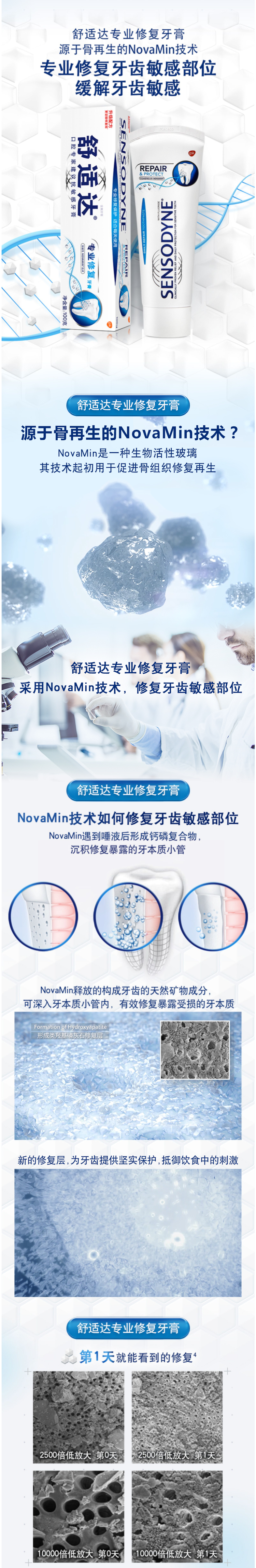 舒适达的专业修复牙膏是世界上首个NovaMin的含氟牙膏。NovaMin技术,最开始用于骨组织修复的材料。NovaMin会释放出构成牙齿的天然成分,刷牙的时候与水结合形成钙磷复合物沉积修复牙小管,抵御外界刺激,真正修复敏感牙齿,更适合牙齿敏感受损人群长期使用。