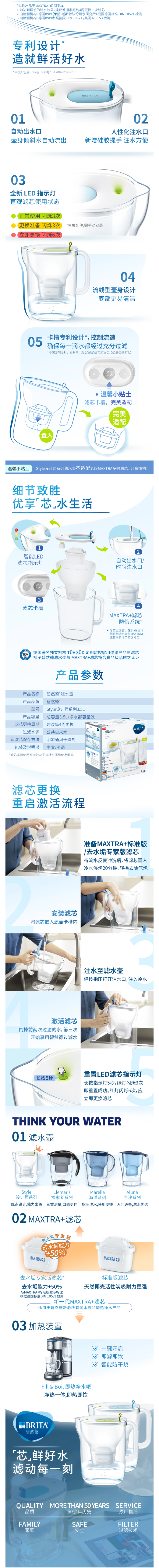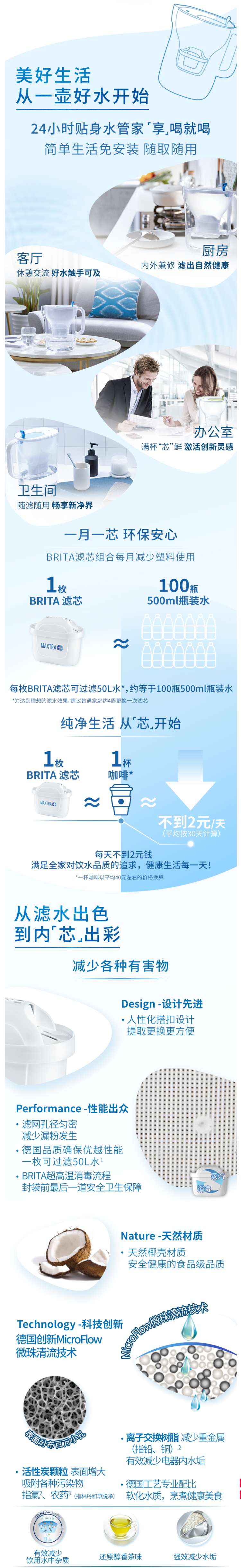 滤芯方面,去水垢加强版滤芯,采用天然椰壳材质制成,安全放心;运用了德国创新MicroFlow微珠清流技术,使水的味道比以往更好。滤芯的Performance性能出众,滤网孔径匀密,减少漏粉的情况发生。