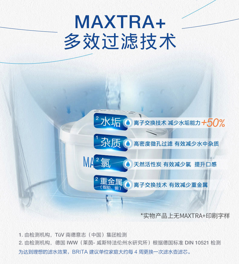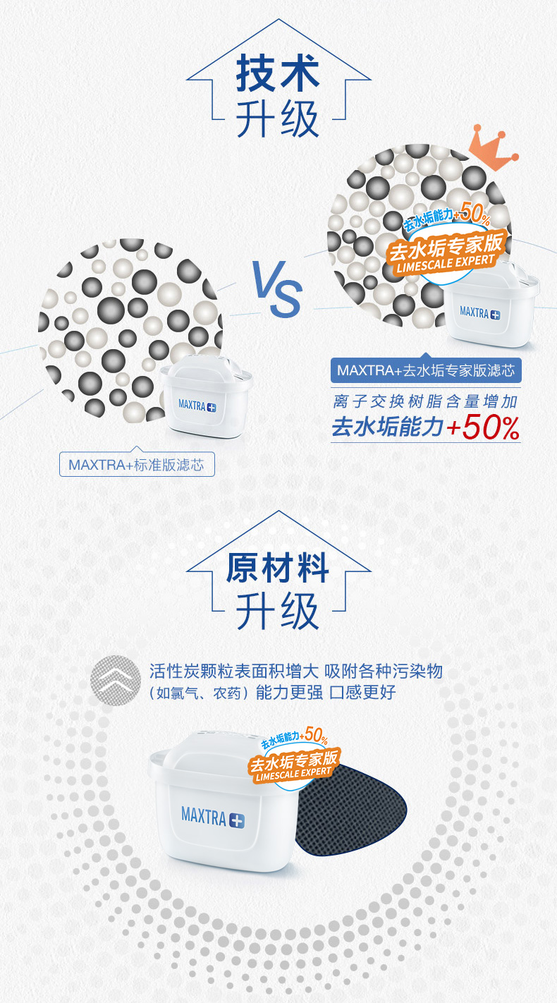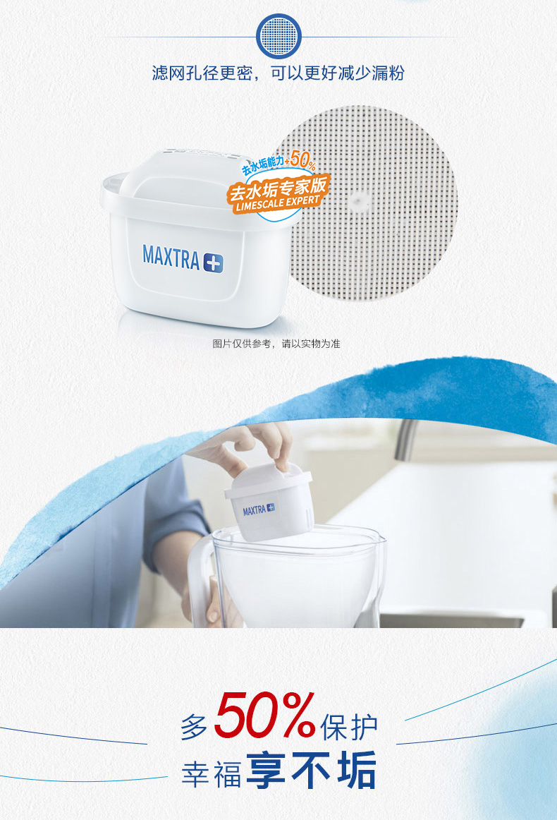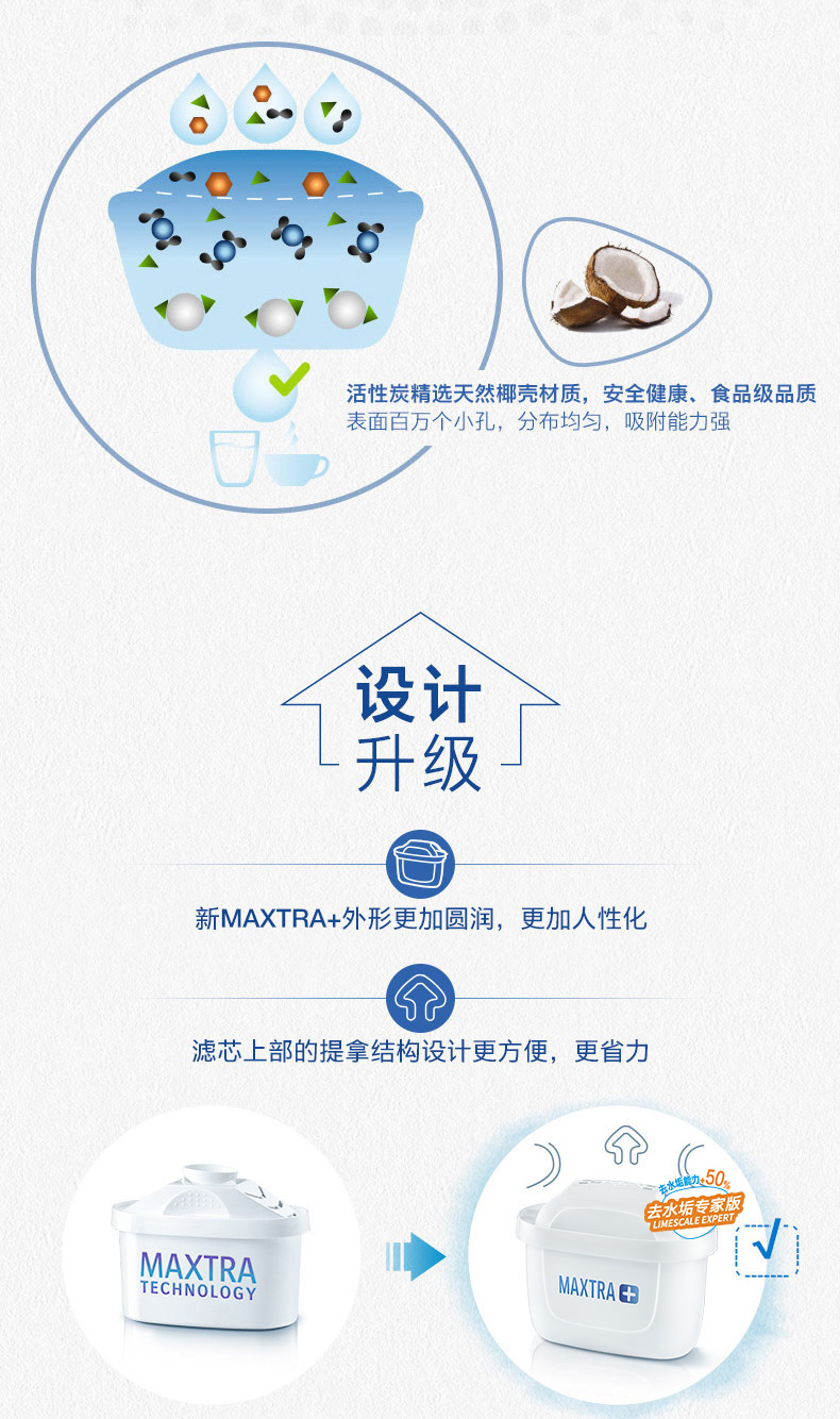 滤芯方面,德国原装进口的Maxtra+,比传统的一代滤芯在过滤能力方面增加了20%,还改良了MicroFlow Technology 微流控技术,使水的味道比以往更好。滤芯中所含的活性炭,能有效过滤水中的重金属、水碱、杀虫剂、有机杂质、氯气和异味。
