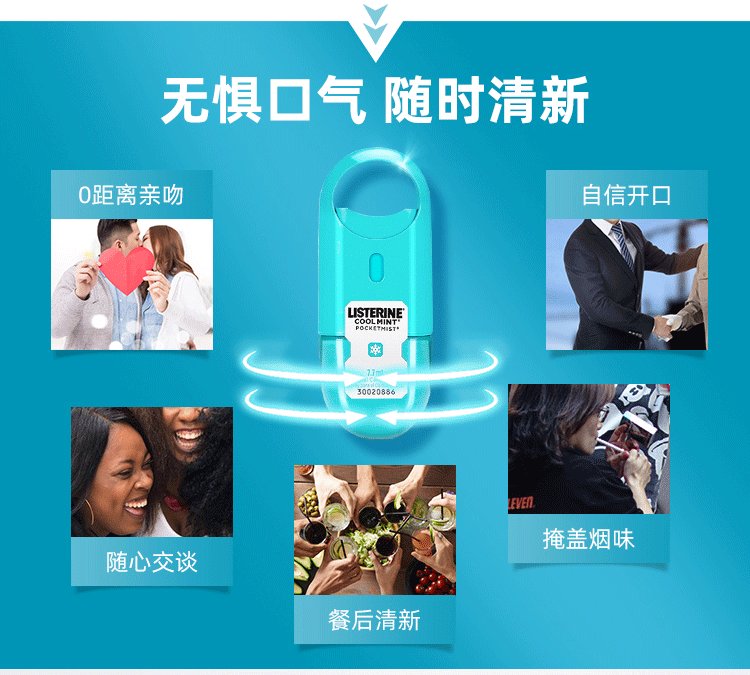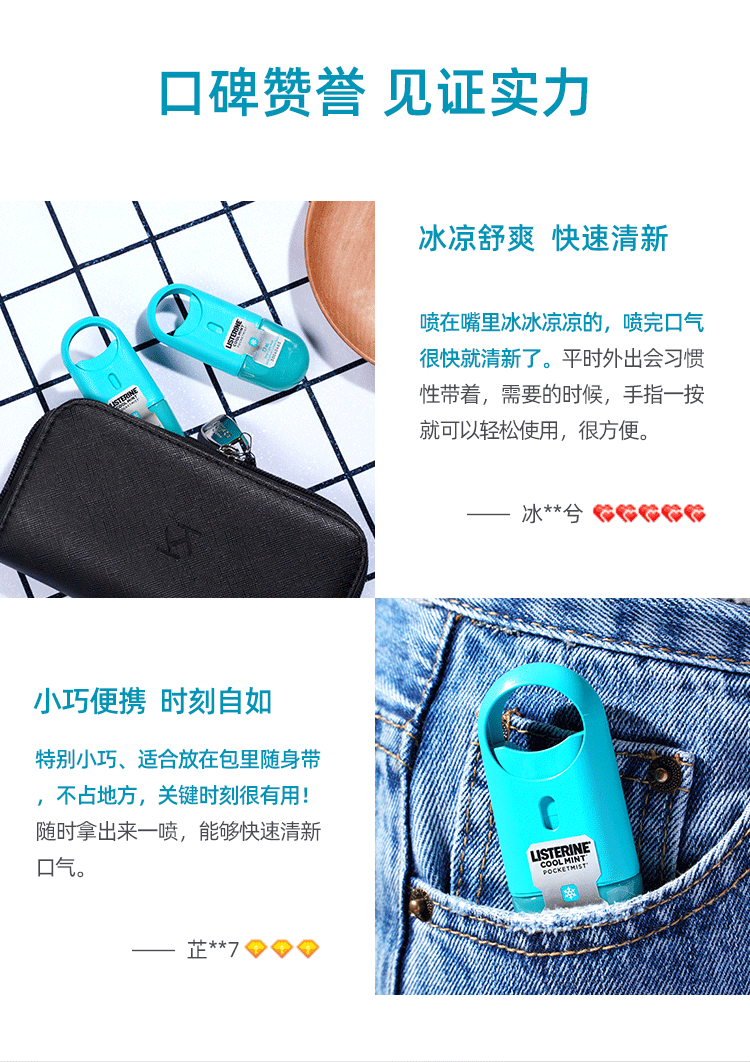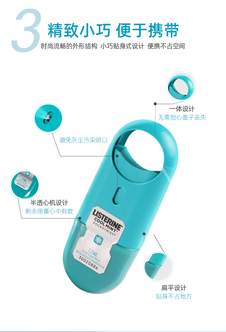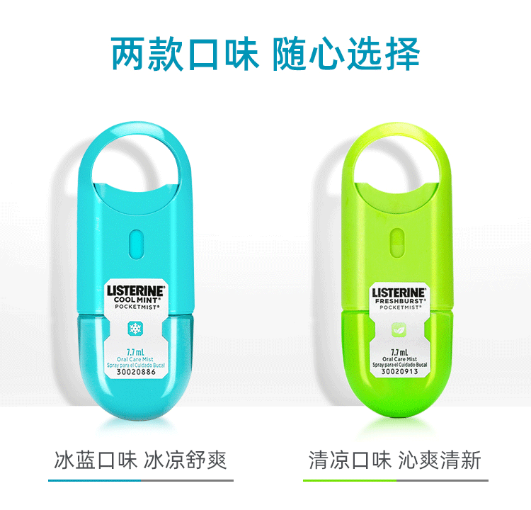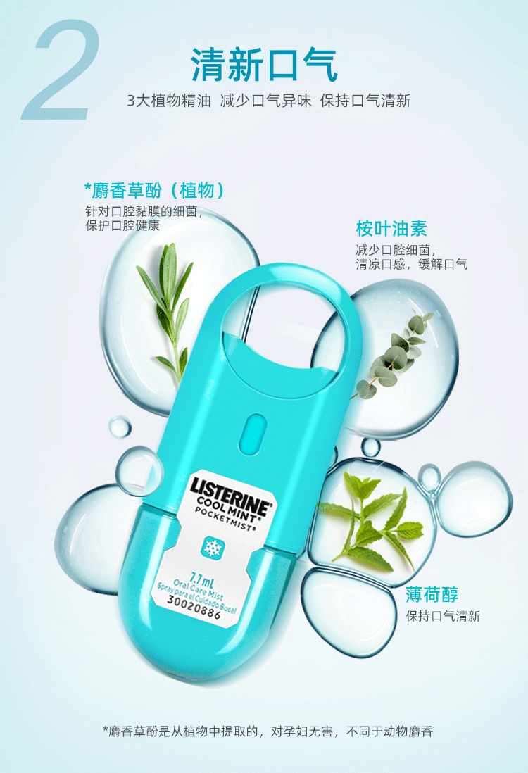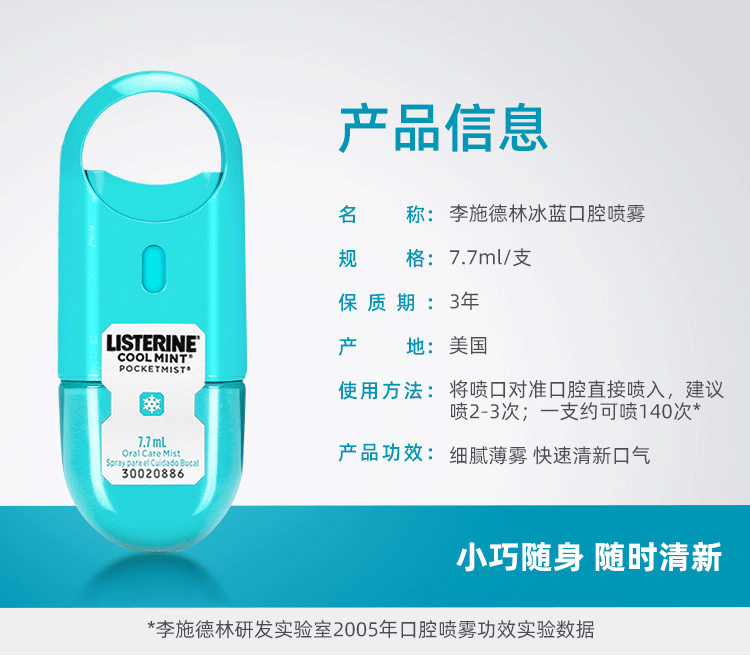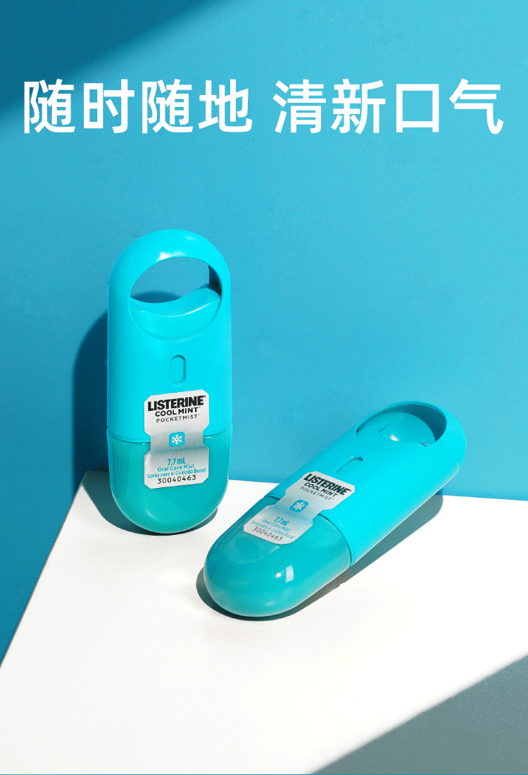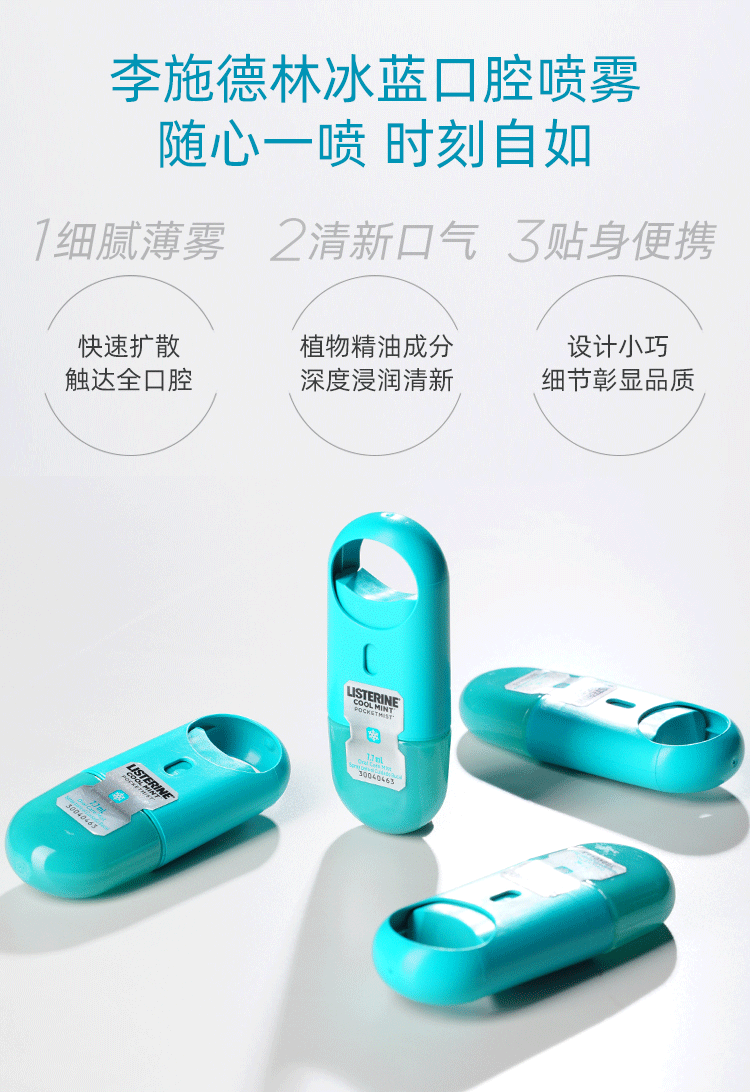 这款李施德林 口腔喷雾,主要作用是清新口气,去除口臭,冰蓝口感,无糖零卡路里,安全健康。外形是扁平设计,便于便携;薄雾小滴液设计,能直达口腔,帮助改善口腔健康。