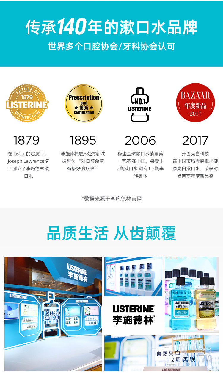 李施德林拥有125年的历史,它以消毒之父Joseph Lister命名。李施德林漱口水自从1914年正式投放零售市场,一直坚持其杀菌的核心功效,是第一个被美国牙医学会认可的非处方品牌漱口水,并获得了其它包括加拿大、澳大利亚、中国香港、爱尔兰等多个牙医学会的专业认证。