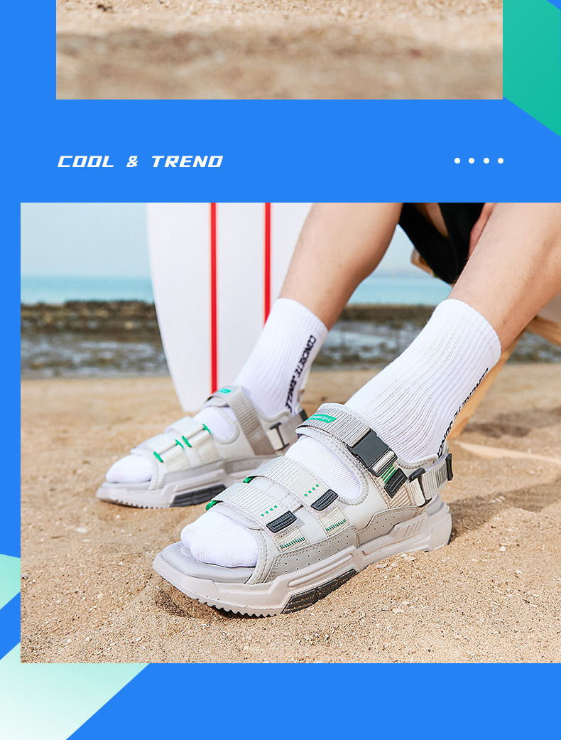 鞋面使用流行的机能风格设计,视觉层次丰富,硬朗有型,与双脚直接接触的内面为高品质四面弹面料,具有很好的包裹感也透气性,不会磨脚捂脚,上脚更加舒适,外层的魔术贴结合搭扣设计,方便随意调节,穿脱更加轻松,也能更好的给脚掌以包裹感。