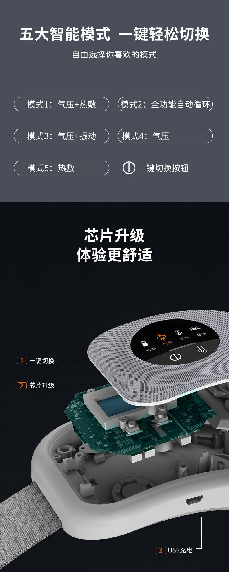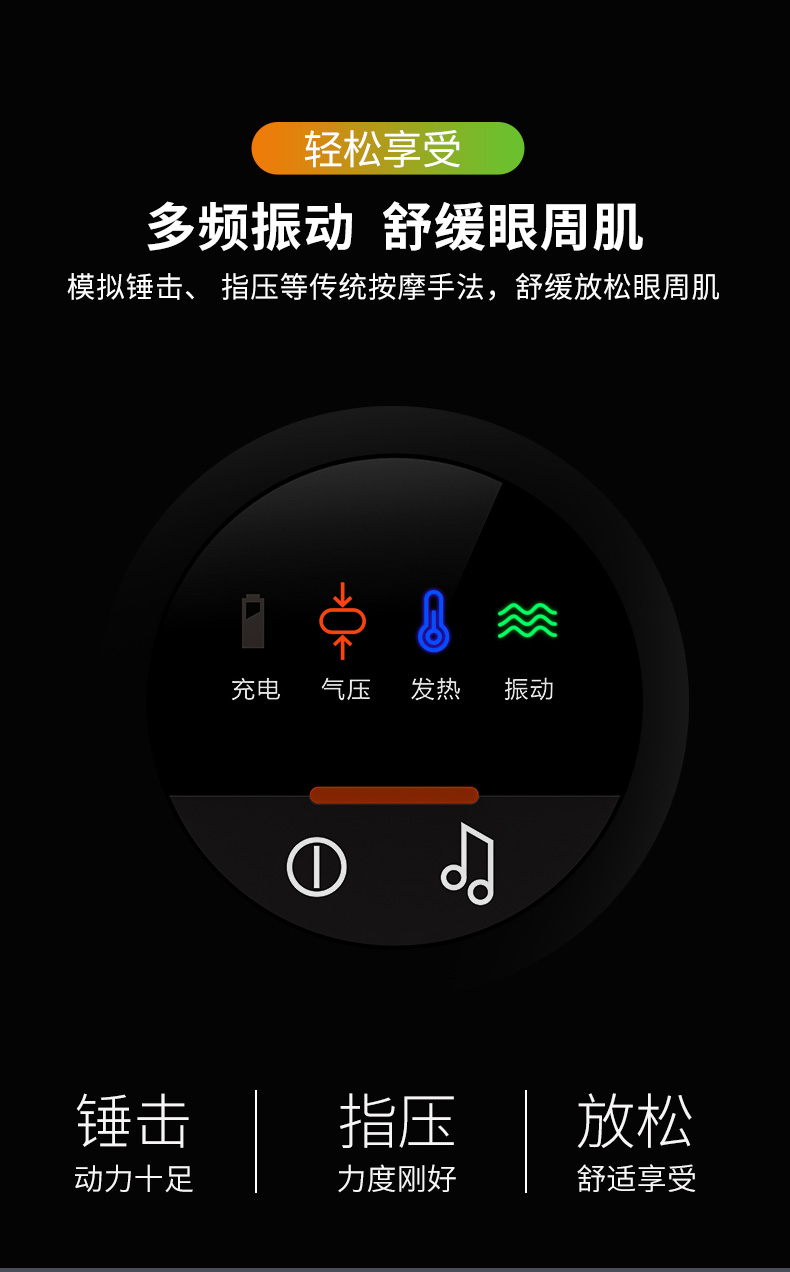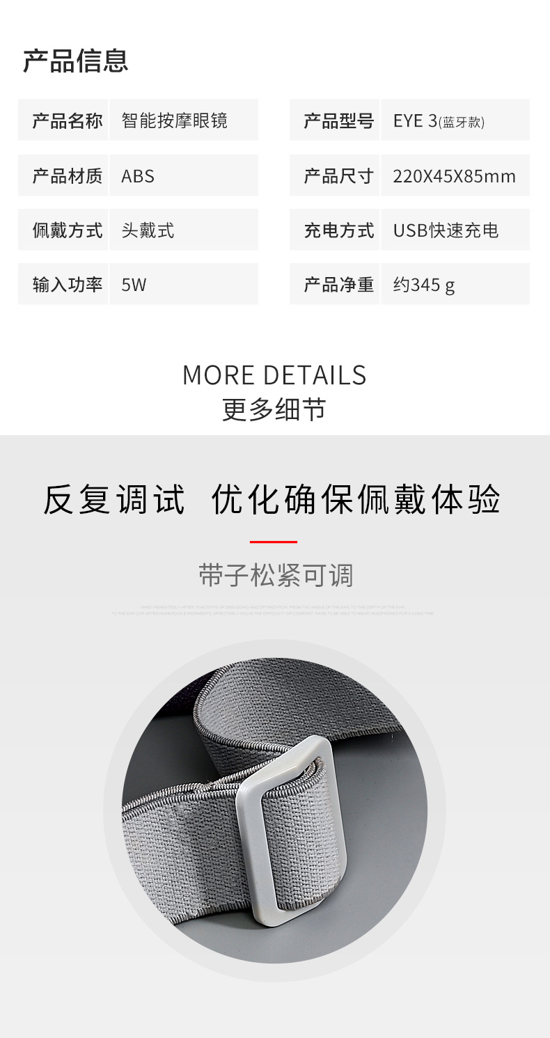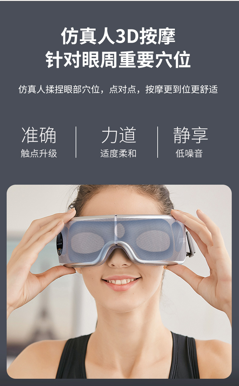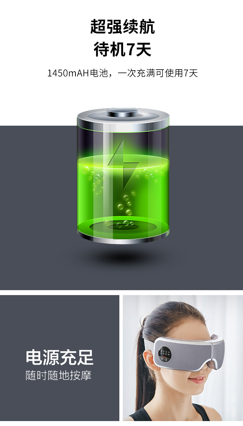 细节上:有五大智能模式,一件切换满足不同需求,180°可折叠设计,贴合眼部不挑脸型,电池容量1450mAh,每天十五分钟,可用7天。