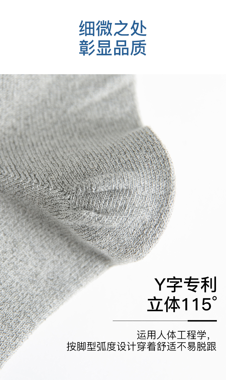 细节上,人体工学剪裁,平痕袜头Y型袜跟设计,更贴合脚型。足弓处4圈防滑条,运动时不易移位,脚跟还有10点防滑硅胶设计,保护跟腱,防止脱落。T型罗口采用高弹莱卡橡筋,相比氨纶弹性更好,使用寿命更长,规格:3双装。