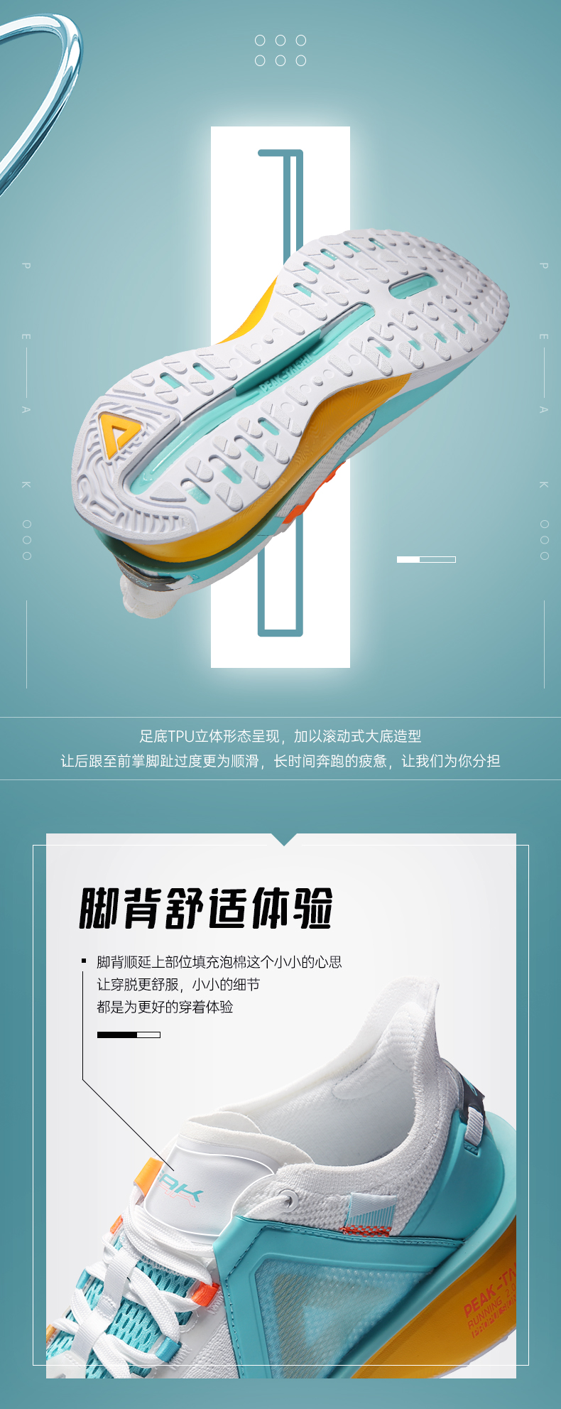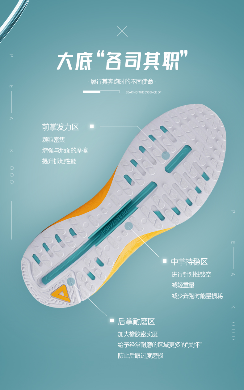 在稳定支撑方面,加大了TPU的范围,一直从前掌外侧延伸到内掌前侧,设计上参考三角形稳定保护结构,增加运动时的稳定性,外底前掌和后掌颗粒密集,提升抓地性能和耐磨性能,中掌针对性镂空,减轻跑步时的能量损耗。