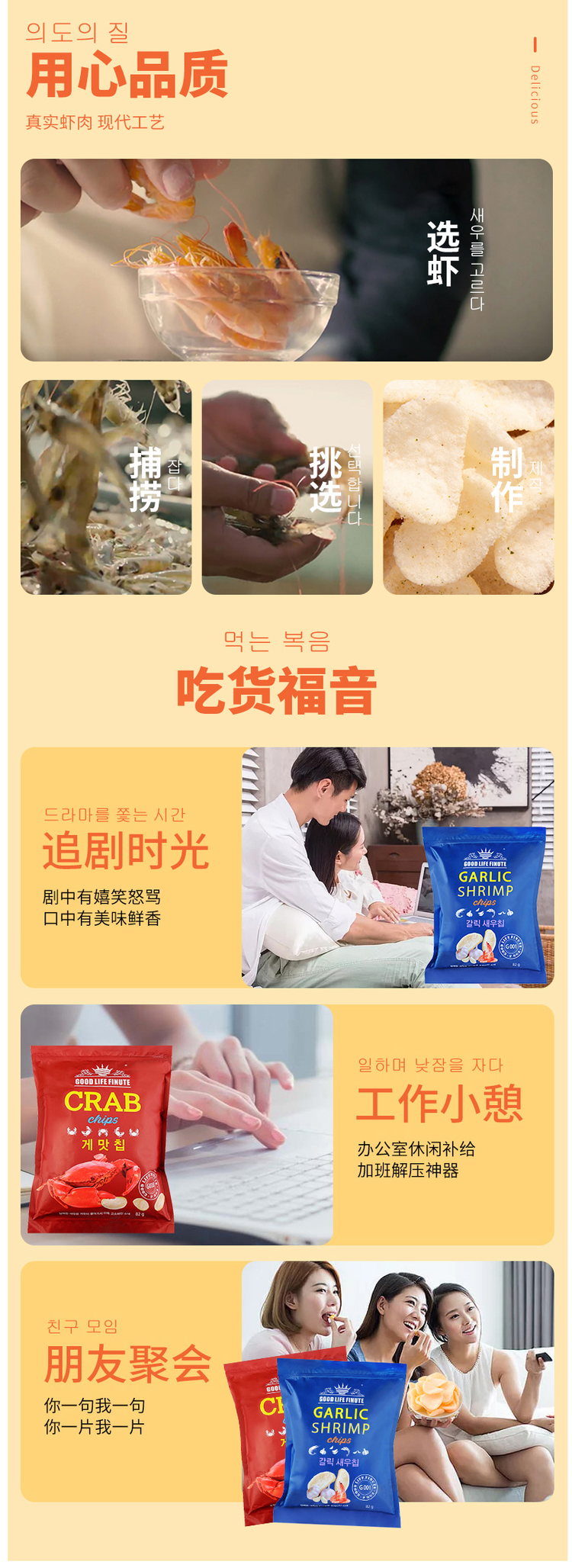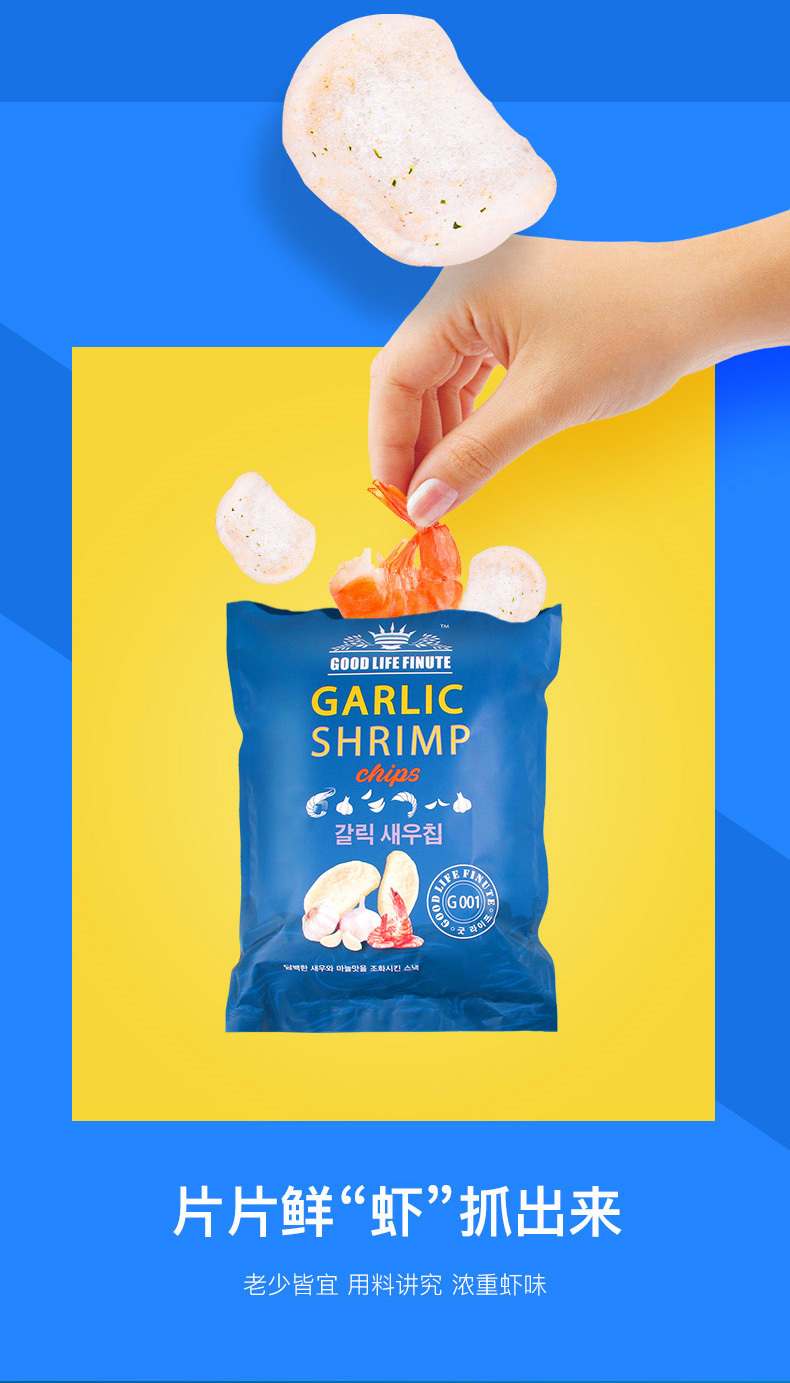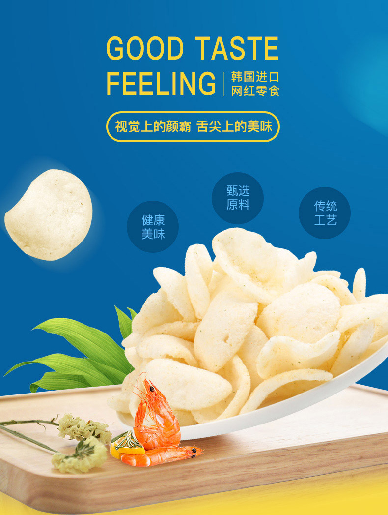 这款趣莱福虾片是韩国进口,使用新鲜虾肉和淀粉等原料混合,轻度过油,蓬松酥脆,入口有浓郁虾味,夹杂着蒜香的口感。