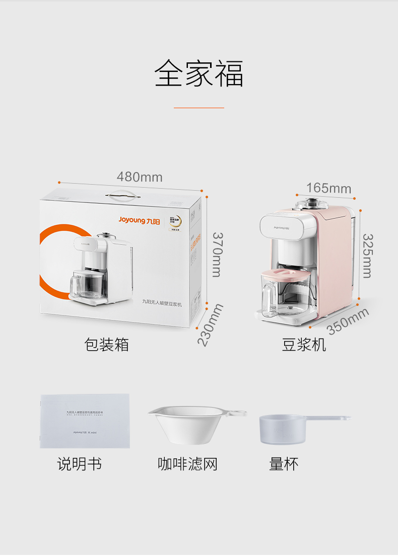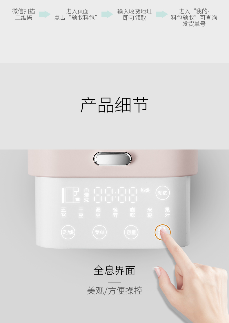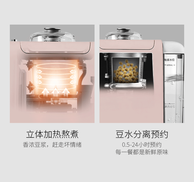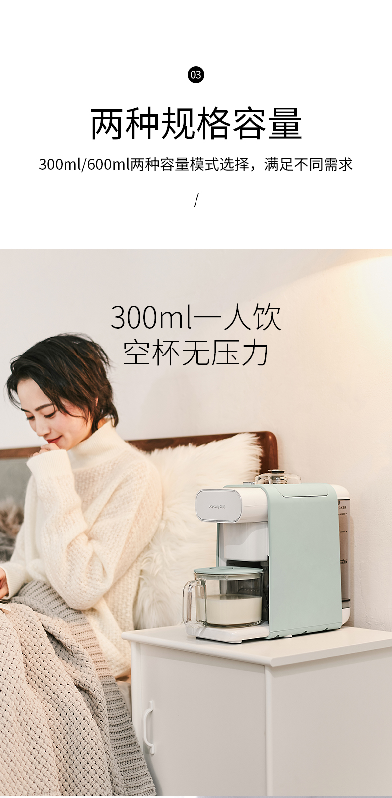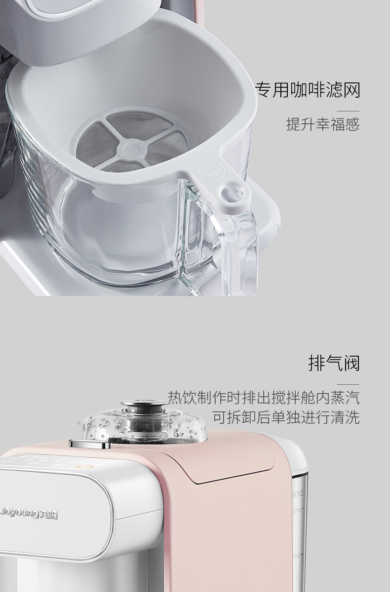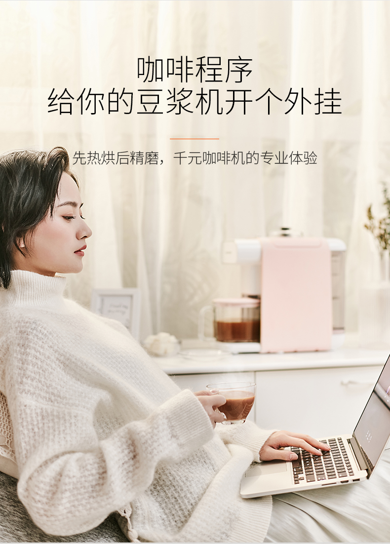 支持干豆制作豆浆,只需将干豆放入研磨腔,容量选择600毫升,大约13分钟后即可完成制作过程,随后自动进入清洗模式。除此以外,还能制作咖啡,果汁等饮品,满足全家人不同的需求。该机提供300和600毫升两种容量,可满足一人或多人饮用。支持0.5-24小时预约功能。带有排气阀,用于制作热饮时排出舱内蒸汽。还提供了专用咖啡过滤网,轻松享受现磨咖啡,提升幸福感。