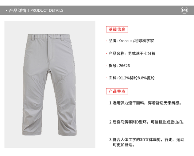 这款地球科学家男休闲裤,七分裤长,正适合现在穿,面料中等偏薄,以91.2%锦纶为主,耐磨和速干,再增加8.8%氨纶,使得裤子具有适度的微弹力,伸展性好还抗皱,在腿部活动时没有拉扯紧绷感,具有良好的穿着体验。