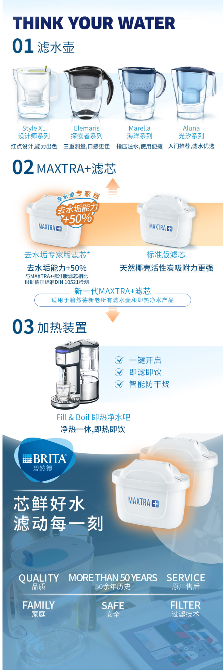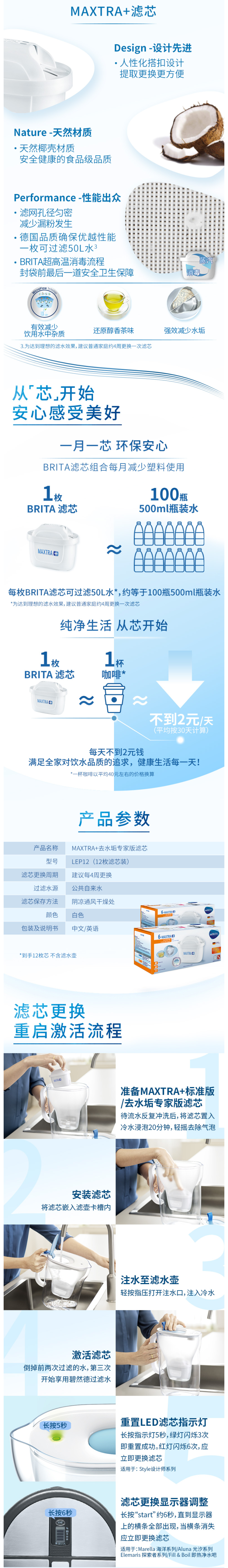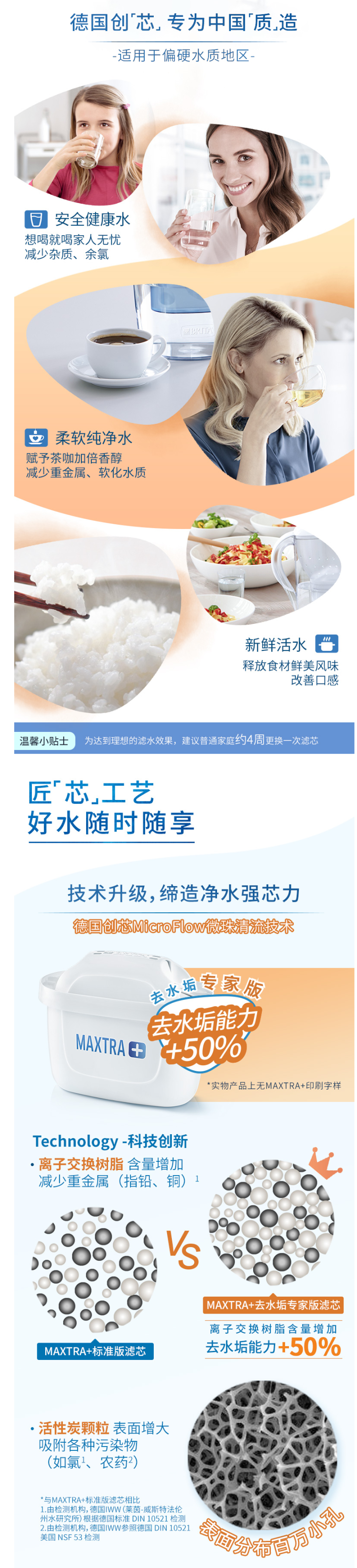 这款碧然德 第三代 MAXTRA+ 去水垢专家版滤芯,是专门针对中国水质研发设计,与MAXTRA+标准滤芯相比,减少水垢能力提高50%,这一效果的技术支撑来源于离子交换树脂含量的增加。