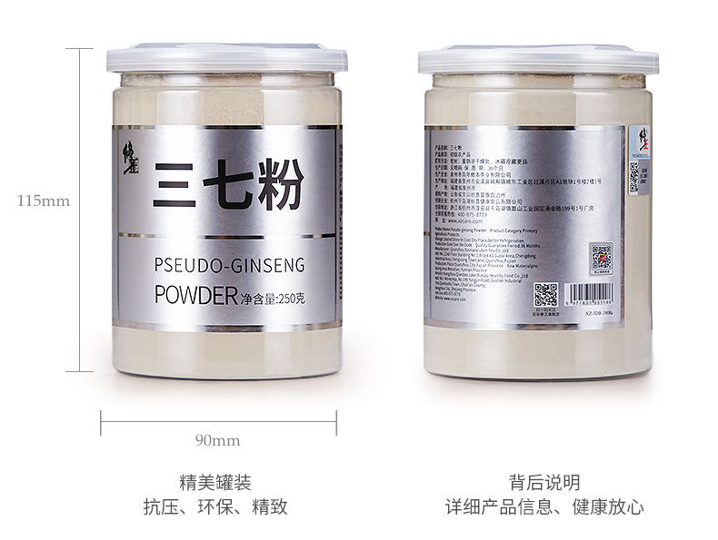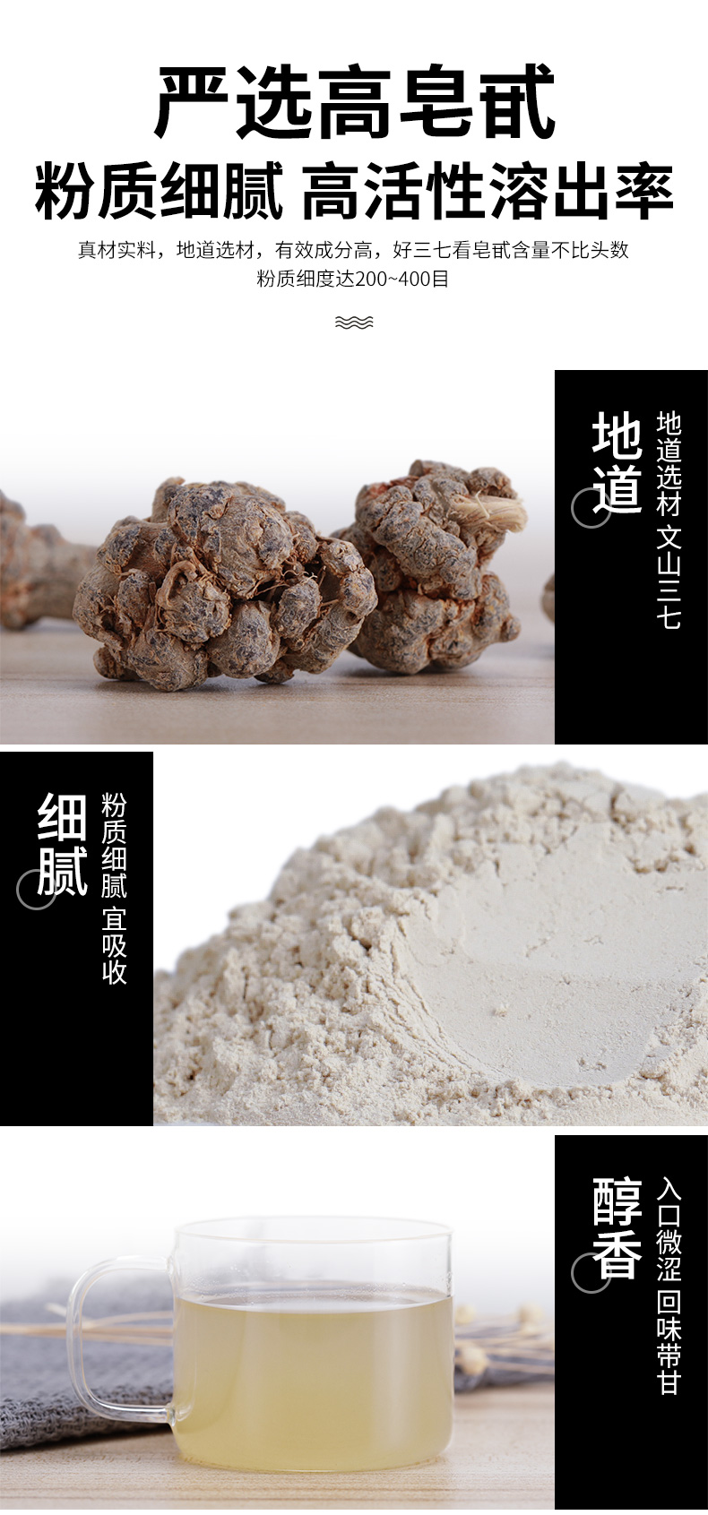 修正三七粉,甄选文山原产地高皂苷三七,经过五道清洗、恒温干燥、在破壁成分,粉质细度可达200-400目,高活性高溶出率、粉质细腻易吸收