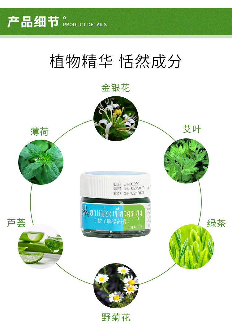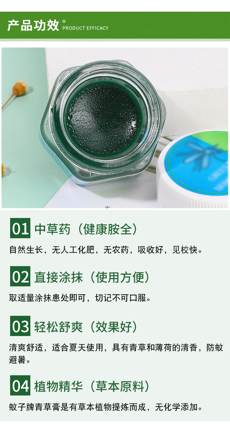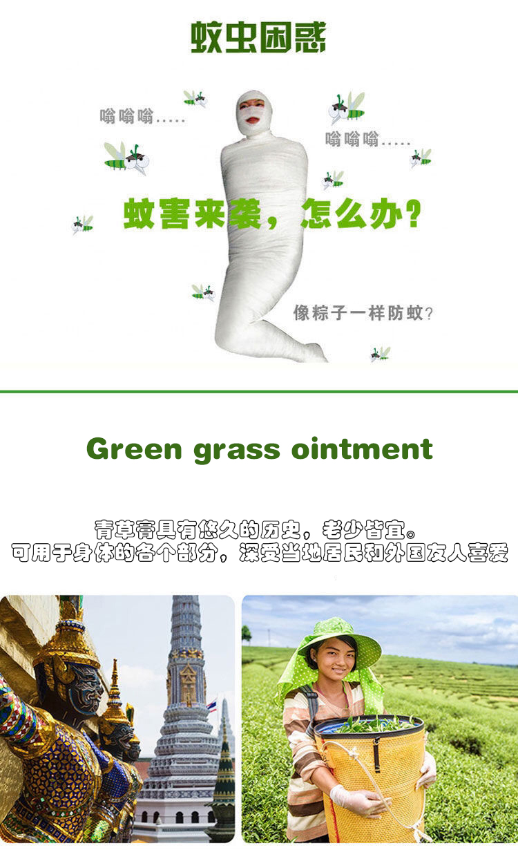 此款青草膏为青色精油膏,不含酒精,有类似薄荷的独特香味。主要成分为鳄嘴花、薄荷油、薄荷醇 、龙脑冰片、樟脑。适用于身体的各部位跌打扭伤,晕车,蚊虫叮咬。女性经期肚子痛抹上一点也很管用。药膏抹上之后会有清凉的感觉,非常适合夏天使用,可防蚊避暑,老少皆宜。领券链接点此
