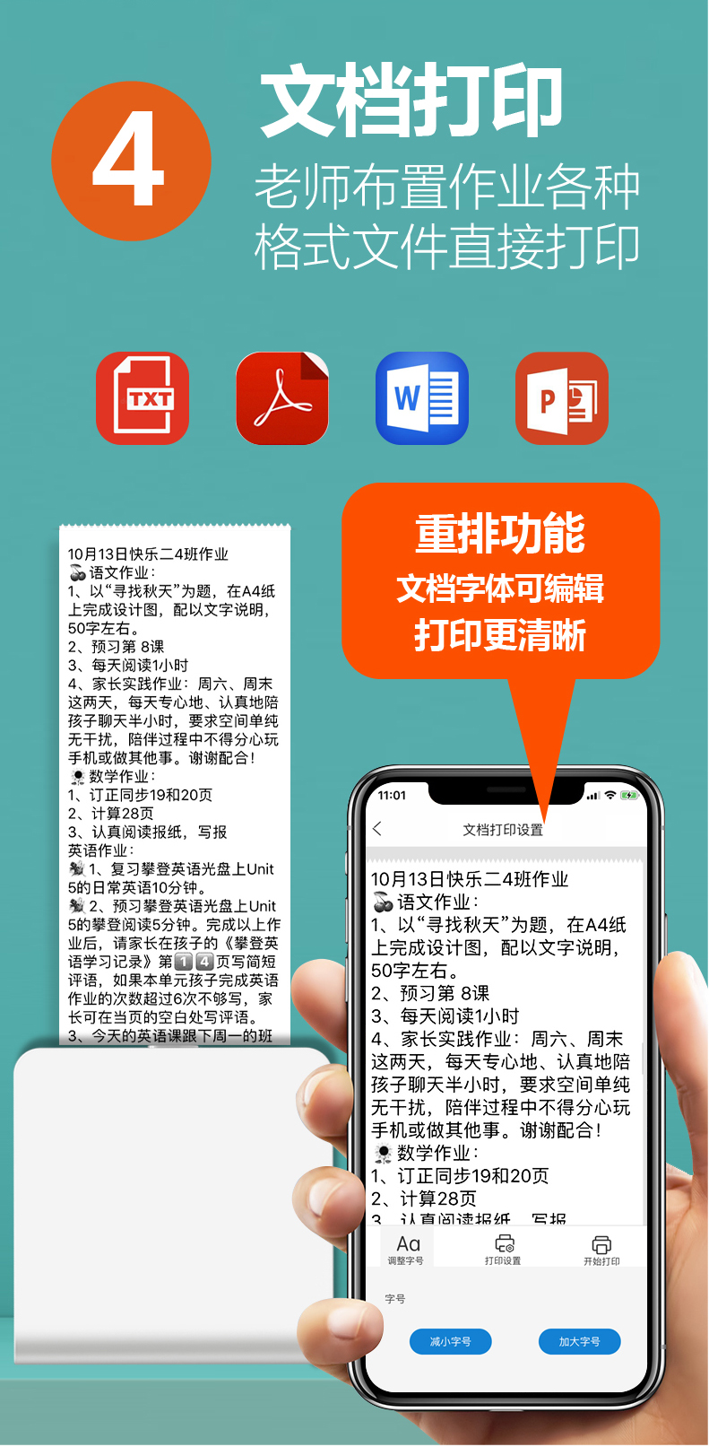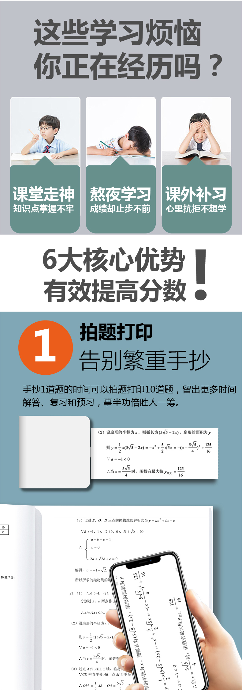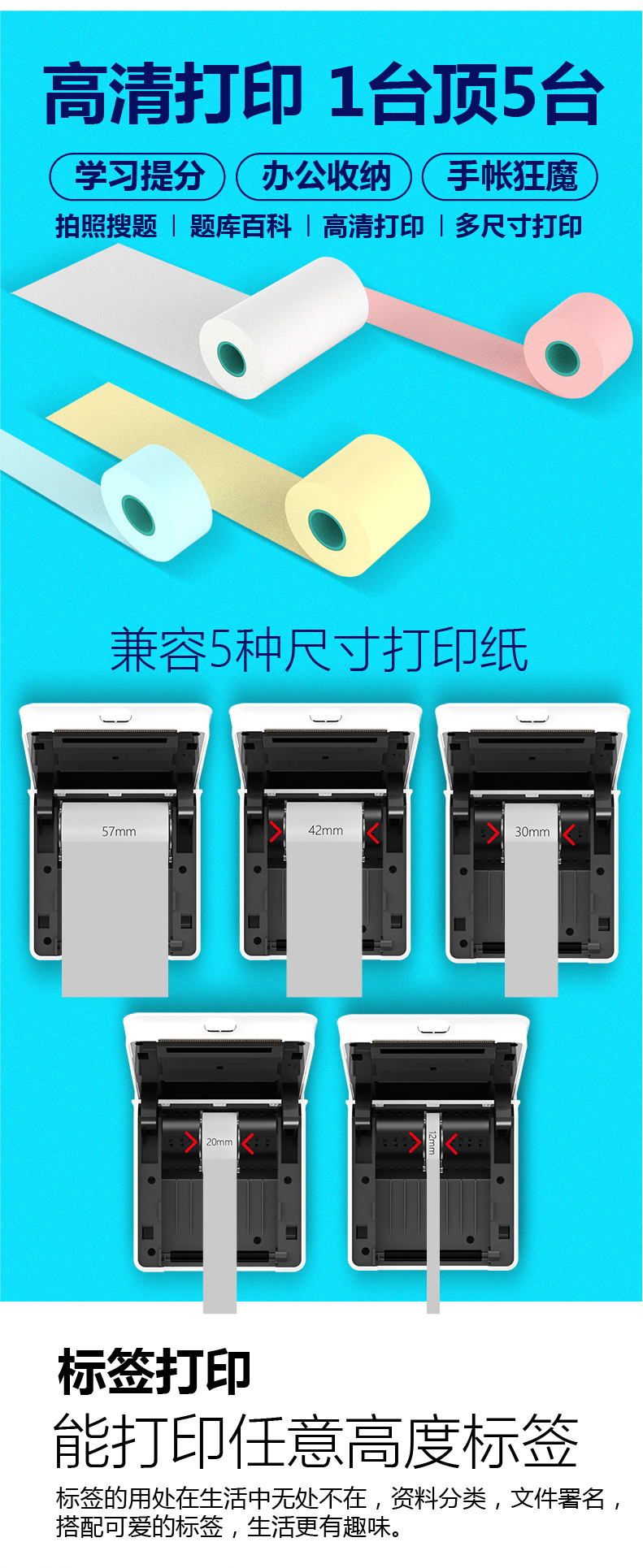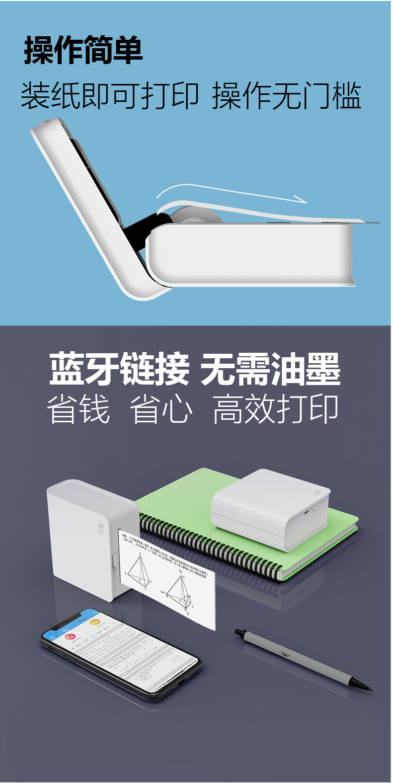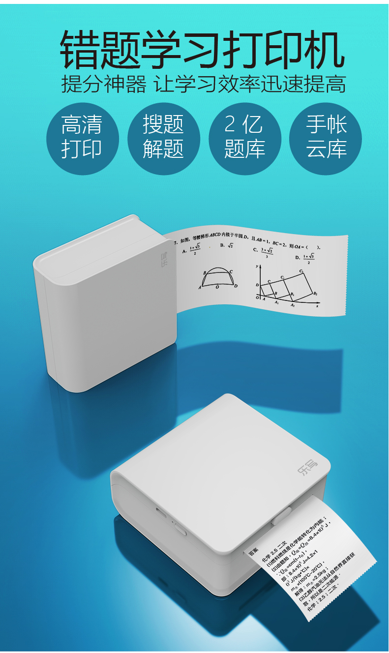学生错题打印机,小巧便携,蓝牙直连,无需添加油墨,环保健康,省钱省心,内800mAh锂电池,续航持久;海量题库,涵盖小学到高中所有科目、大学主要科目,遇到难题随手一拍,秒出答案;把错题打印出来粘贴在错题本上,不用手抄,方便复习。